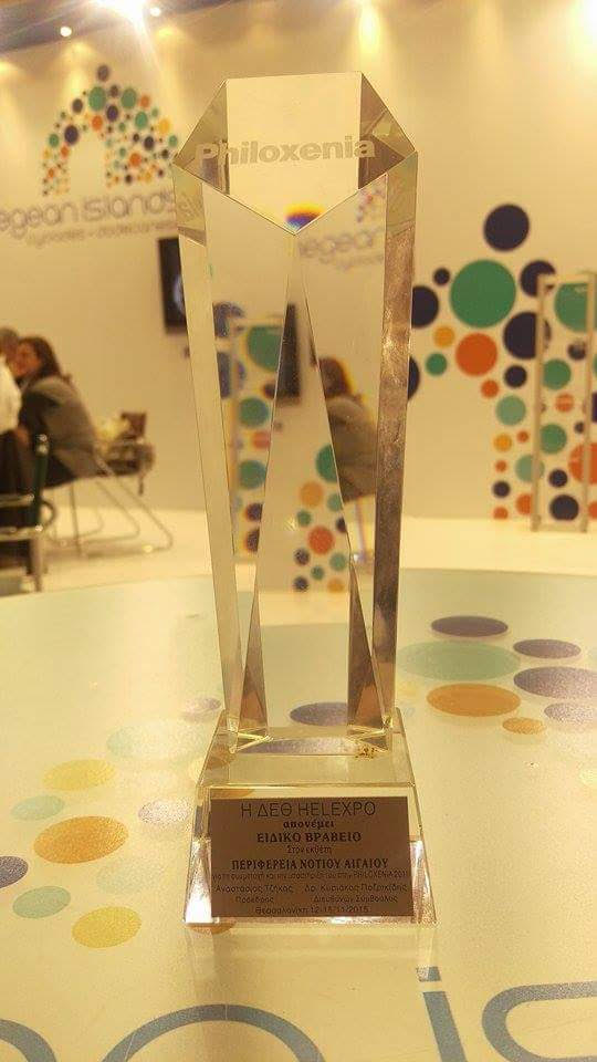 Η ΔΕΘ HELEXPO στο πλαίσιο της 31ης Διεθνούς Τουριστικής Έκθεσης “PHILOXENIA 2015” που πραγματοποιήθηκε στην Θεσσαλονίκη από τις 12 έως και τις 15 Νοεμβρίου, βράβευσε το περίπτερο της Περιφέρειας Νοτίου Αιγαίου, ως το κορυφαίο από άποψη αισθητικής και ποιότητας.