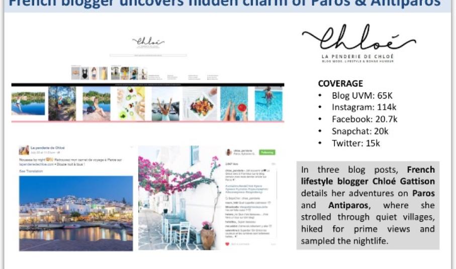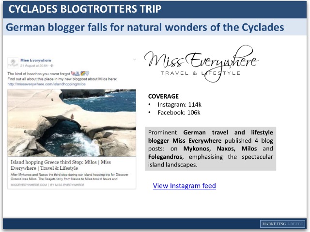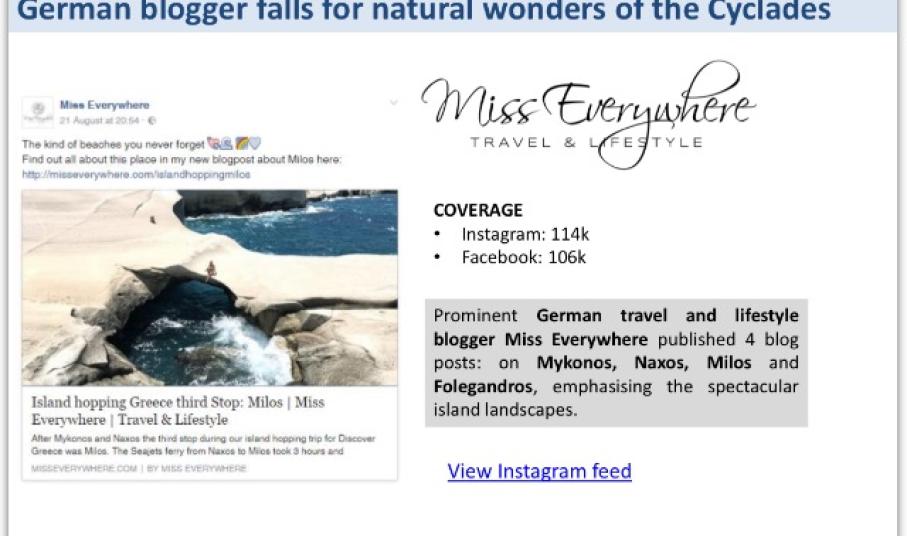 Επιπρόσθετα, πλήθος ισχυρών διαμορφωτών ψηφιακής γνώμης, επισκέφτηκαν τον Αύγουστο τα νησιά του Νοτίου Αιγαίου τροφοδοτώντας τα μέσα κοινωνικής δικτύωσης με στιγμές, τοπικές συνήθειες και εικόνες, κάνοντας κοινωνούς της εμπειρίας τους, τα εκατομμύρια κοινού τους. Μέσα από την καινοτόμα πλατφόρμα προώθησης storytelling ταξιδιωτικών εμπειριών “Blogtrotters” της Marketing Greece και το εργαλείο μέτρησης “The Blog trotters Sensometer”, που μετρά τα social media page impressions των digital influencersκαι που μέχρι τώρα απαριθμεί περισσότερα από 91.000.000 impressions, αποτελεί απόδειξη του υψηλού ενδιαφέροντος προς τους ελληνικούς προορισμούς και ειδικότερα προς τους προορισμούς του Νοτίου Αιγαίου. Οι INTHEFROW, MATIAMU, MISSEVERYWHERE,CHLOE, EMILYLUXTONTRAVELS είναι μερικοί από τους bloggers που αποκάλυψαν μέσα από τις αναρτήσεις τους στα socialmedia αλλά και από τα blogs/vlogs τους, τους κρυμμένους θησαυρούς του Νοτίου Αιγαίου.