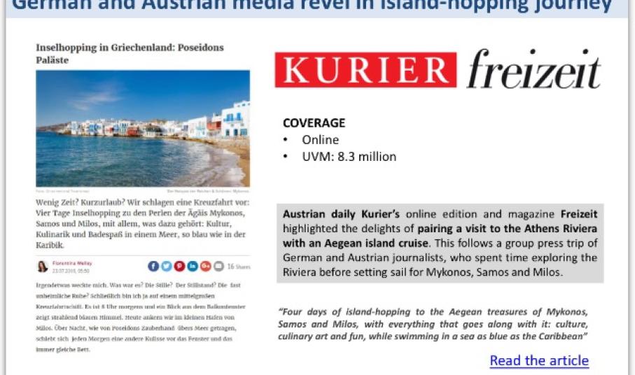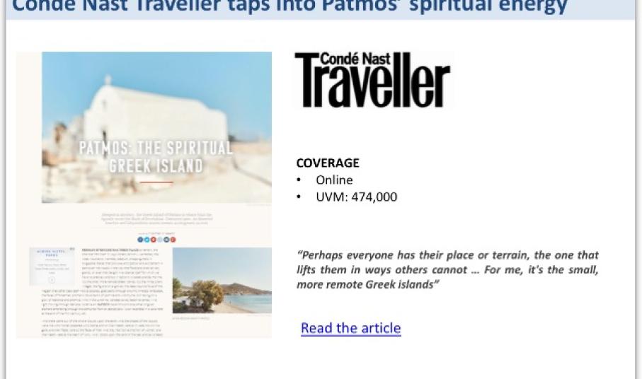 Παραδειγμα το Conde Nast Traveller,UK και το Vanity Fair.it αποκαλούν την Πάτμο και την Κάρπαθο «επίγειο παράδεισο» και «ησυχαστήριο με μεσογειακό αέρα», αντίστοιχα, ενώ το άρθρο της αυστριακής εφημερίδας KURIER, αποκαλύπτει την ξεχωριστή εμπειρία του island-hopping και το παρουσιάζει ως την ιδανική μορφή διακοπών.