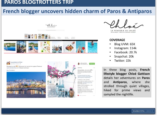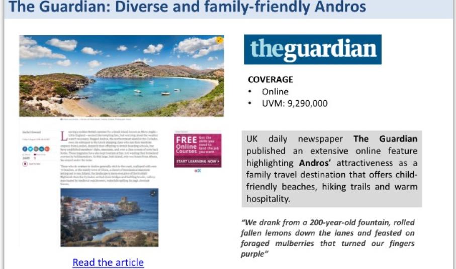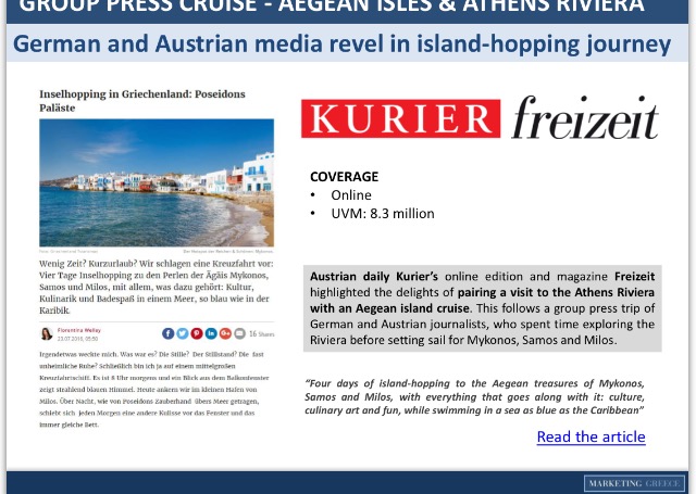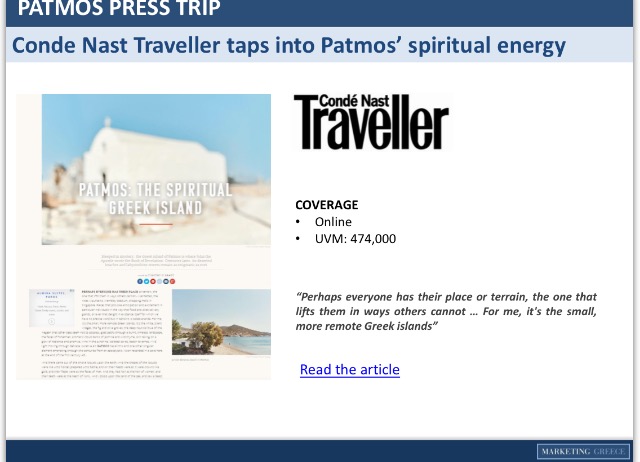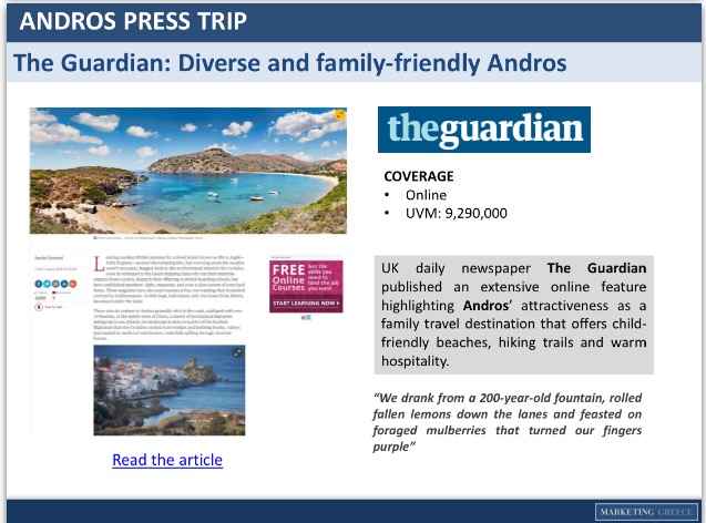 ‘Ήδη τα αποτελέσματα αυτού του προγράμματος είναι εντυπωσιακά. Πλήθος δημοσιευμάτων σε κορυφαία έντυπα και ηλεκτρονικά ΜΜΕ μόνο την περίοδο Ιουλίου-Αυγούστου προέβαλλαν τα νησιά μας σε ένα κοινό που ξεπερνά τα 26 εκατομμύρια!