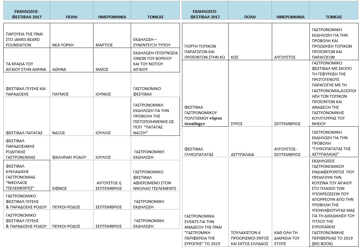 •             Διοργάνωση ή/και συνδιοργάνωση γαστρονομικών εκδηλώσεων με φορείς του τουρισμού, του πρωτογενούς τομέα κ.λπ. για την προβολή της αιγαιακής κουζίνας