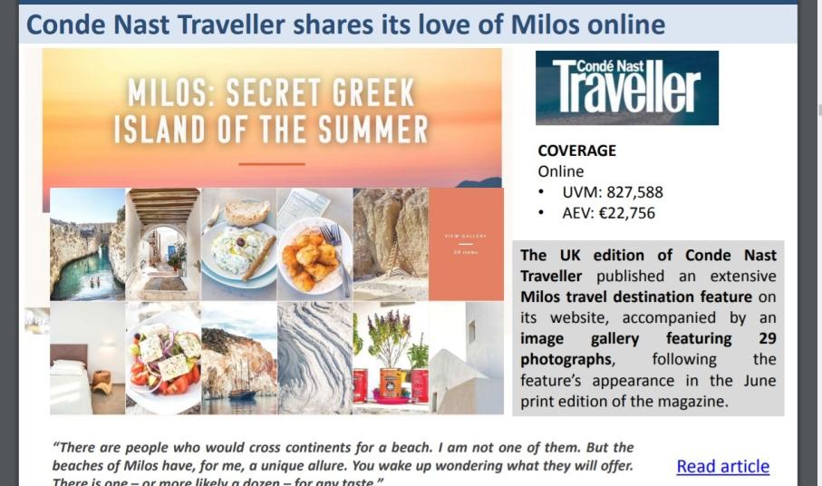 Το Conde Nast Traveller, UK δημοσίευσε ένα 10σέλιδο αφιέρωμα για τη Μήλο, εστιάζοντας στην ιστορία και στον πολιτισμό του νησιού, τις παραλίες, τη γαστρονομία και τη φιλοξενία. Στον ιστότοπο του Conde Nast Traveller, UK δημοσιεύθηκε ένα αφιέρωμα για τη Μήλο που συνοδεύεται από 29 φωτογραφίες του νησιού. Στη Βελγική έκδοση του ELLE, δημοσιογράφος Celine Pecheux ανακαλύπτει τη μαγεία των οικογενειακών διακοπών.