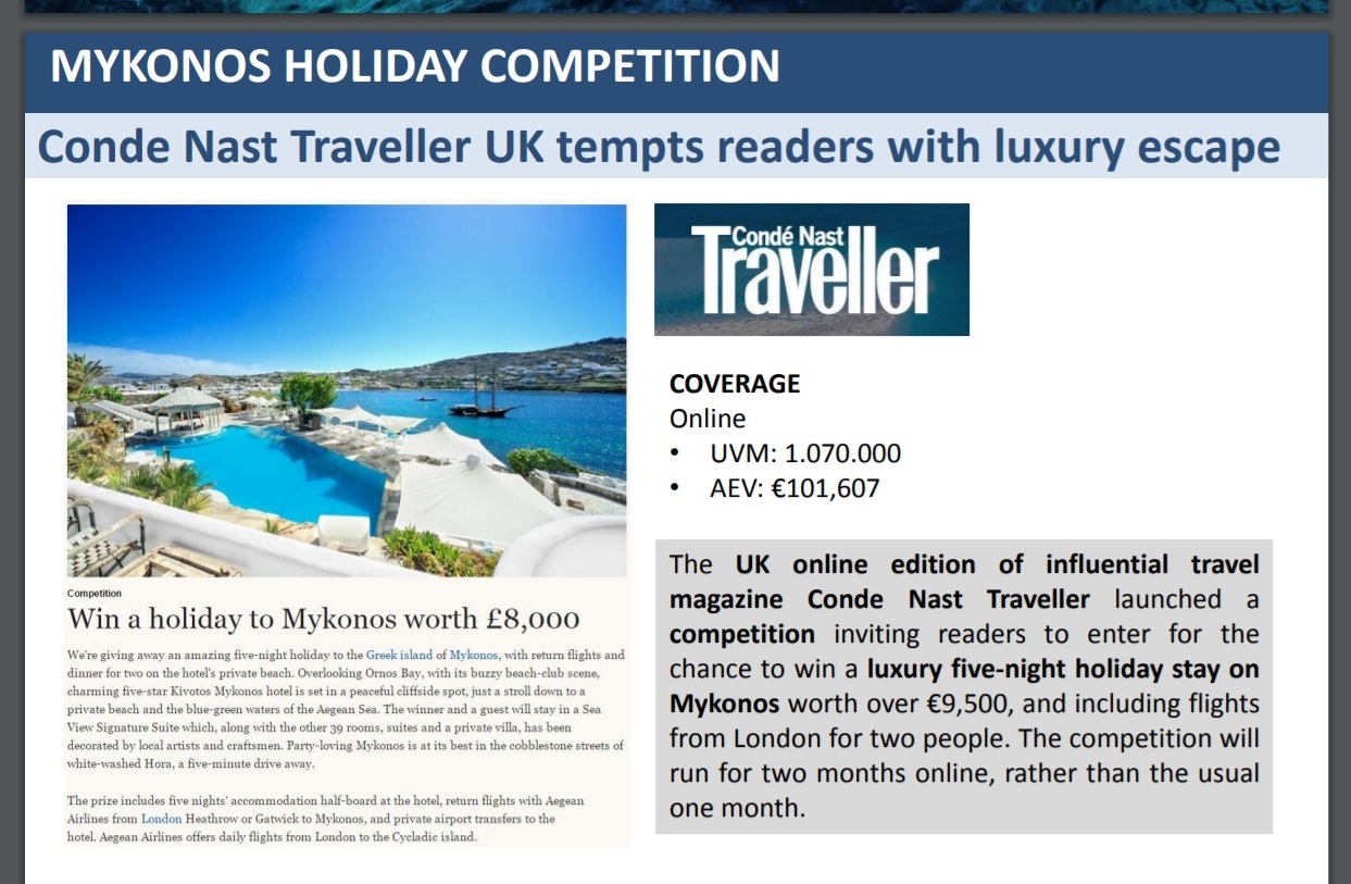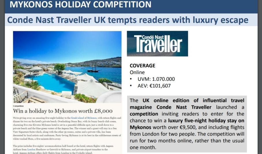 Η εκπομπή ψυχαγωγίας και lifestyle των Η.Π.Α., HollywoodReporter ταξίδεψε στη Μύκονο, στα Κουφονήσια, στην Αντίπαρο και την Ύδρα και κάνει λόγο για τέσσερα ελληνικά κοσμοπολίτικα νησιά που λατρεύουν οι διασημότητες. Τη Μύκονο επισκέφθηκε και το Μεξικάνικό τηλεοπτικό ταξιδιωτικό δίκτυο DestinosdelMundo, που πρόβαλε ντοκιμαντέρ για το νησί των ανέμων, ενώ τον Μάρτιο 2018 αναμένεται να προβληθεί και η εκπομπή του καναλιού για Ρόδο & Σύμη.
