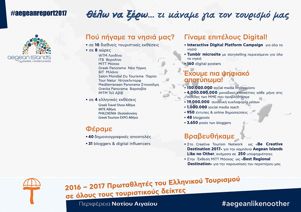 Η περιφερειακή αρχή, η οποία, τα τελευταία τρία χρόνια έχει ως στρατηγικό πλαίσιο δράσης την αντιμετώπιση του Νοτίου Αιγαίου ως Πρωταθλητή του ελληνικού τουρισμού, μετά τις εντυπωσιακές επιδόσεις του 2016, που το κατέταξαν στην κορυφή, συνέχισε σε εργάζεται με διεθνείς προδιαγραφές, επενδύοντας μεγάλο ποσοστό πόρων, οικονομικών και ανθρώπινων, στον μοναδικό κλάδο της οικονομίας των νησιών που δίνει ελπίδα, αισιοδοξία, εισόδημα και θέσεις εργασίας. Και το 2017, επένδυσε στην συνεχή παρουσία της Περιφέρειας, όπου υπάρχει προοπτική διατήρησης ή απόκτησης μεριδίου αγοράς, όπου και όπως μπορούν τα νησιά των Κυκλάδων και των Δωδεκανήσων να παρουσιάσουν την ταυτότητα και τις δυνατότητες που δίνουν στον επισκέπτη τους και εγκαινιάζοντας και υλοποιώντας στην πράξη την ψηφιακή παρουσία των νησιών, της πλέον σύγχρονης και αποδοτικής οδού προβολής και προώθησης ενός προορισμού.