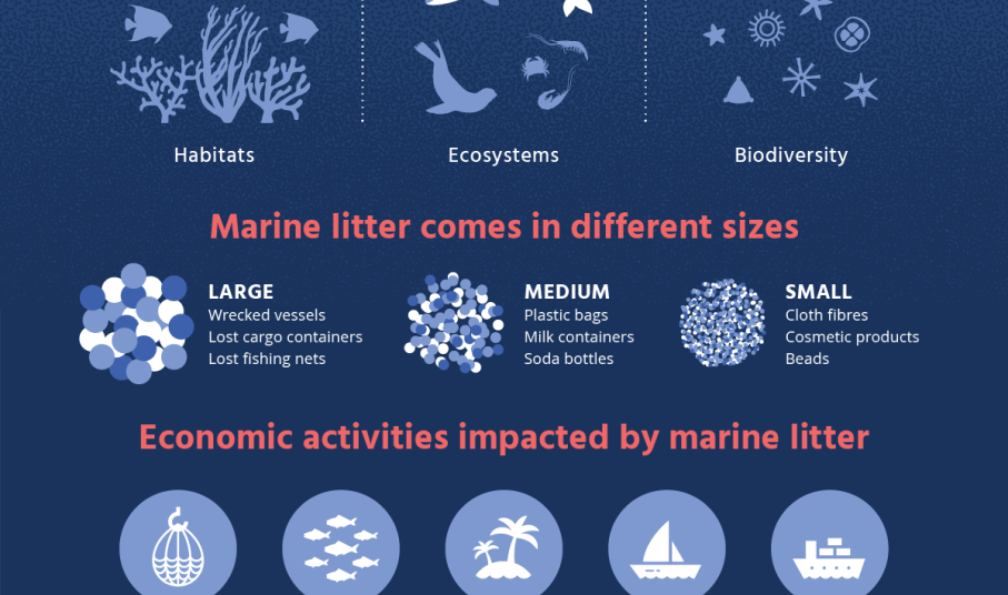 Η ρύπανση του θαλάσσιου περιβάλλοντος, ιδιαίτερα με πλαστικά, έχει λάβει ανησυχητικές διαστάσεις. Υπολογίζεται πως σε θάλασσες και ωκεανούς καταλήγουν κάθε χρόνο 8 εκατομμύρια τόνοι πλαστικών απορριμμάτων! Μια τεράστια απειλή για τους πληθυσμούς 600 ειδών θαλάσσιων οργανισμών, οι οποίοι τραυματίζονται ή πεθαίνουν επειδή παγιδεύονται σε αυτά ή τα τρώνε. Σημαντικές είναι και οι οικονομικές επιπτώσεις των απορριμμάτων σε παράκτιες περιοχές λόγω της αισθητικής ρύπανσης, της μειωμένης τουριστικής κίνησης, του κόστους καθαρισμού κ.ά.