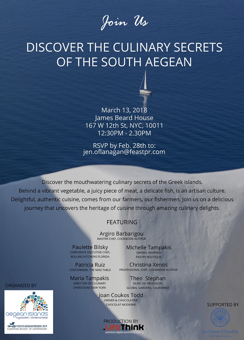 Στον ναό της Γαστρονομίας των ΗΠΑ, το James Beard Foundation, στη Νέα Υόρκη, η Περιφέρεια Νοτίου Αιγαίου, Γαστρονομική Περιφέρεια της Ευρώπης 2019, παρουσιάζει για δεύτερη συνεχόμενη χρονιά τα μυστικά της γαστρονομικής παράδοσης του Νοτίου Αιγαίου, την Τρίτη 13 Μαρτίου 2018.