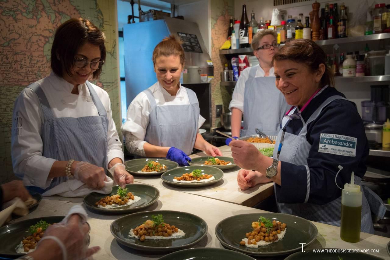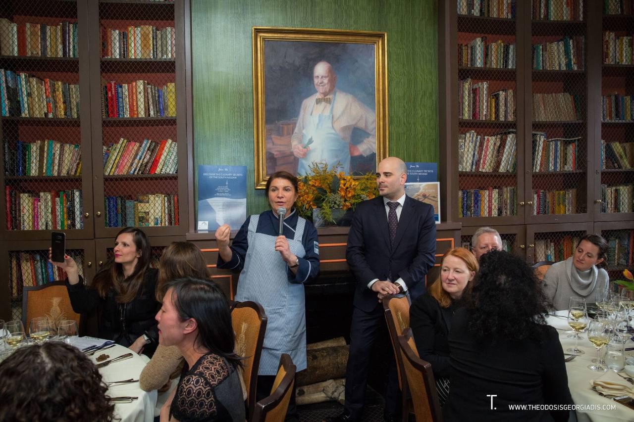 Την Τρίτη 13 Μαρτίου, οι σημαντικότεροι δημοσιογράφοι γαστρονομίας και γαστρονομικού τουρισμού, από τα μεγαλύτερα αμερικανικά ΜΜΕ, μεταξύ των οποίων η Wall Street Journal και οι New York Times, food bloggers και food and luxury travel opinion leaders, μυήθηκαν στα μυστικά της αιγαιακής κουζίνας στο James beard House, γνωστό ως “ναό” της Αμερικανικής Γαστρονομίας, όπου κάθε Αμερικανός σεφ ονειρεύεται μια φορά να μαγειρέψει. Όσπρια, θαλασσινά, χόρτα λάδι και βότανα από τα νησιά ήταν οι πρωταγωνιστές που “μάγεψαν” τους γευστικούς κάλυκες του κοινού και ταξίδεψαν το μυαλό τους στο αρχιπέλαγος του Αιγαίου.