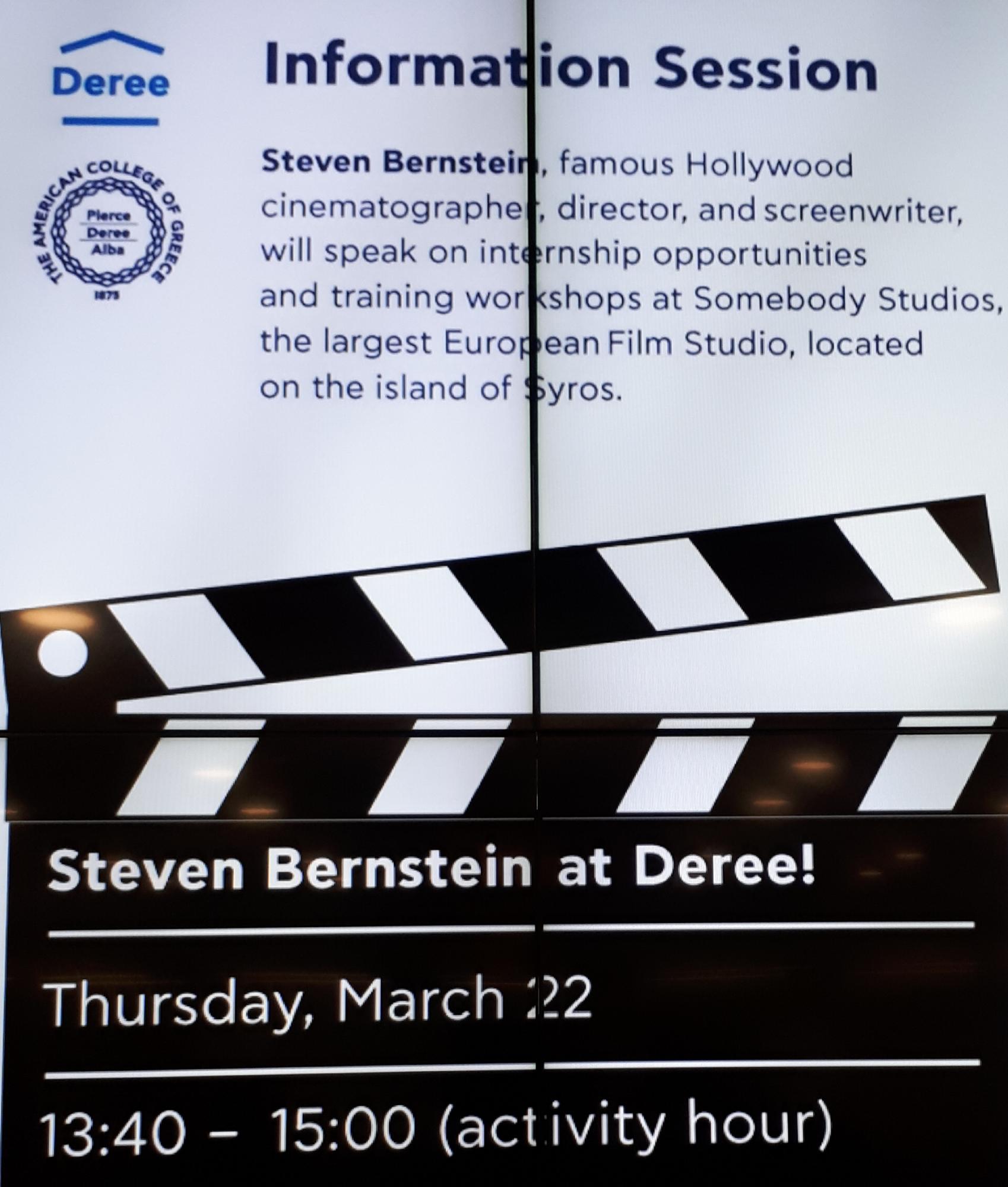 Ο κ. Berstein, που επισκέπτεται εκ νέου τη χώρα μας προκειμένου να προωθήσει το σχέδιό του για τη δημιουργία σχολής κινηματογράφου και studios παραγωγής ταινιών στη Σύρο, παρουσίασε την πρότασή του στο κατάμεστο αμφιθέατρο του Ελληνοαμερικανικού Κολλεγίου.