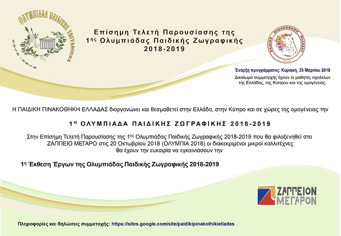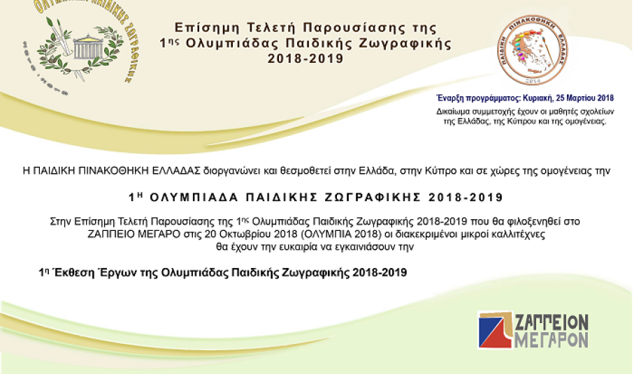 Μικροί καλλιτέχνες από όλες τις Κυκλάδες στο πλαίσιο του Παιδικού Φεστιβάλ των Κυκλάδων Syroskidz 2 και της 4ης Υπαίθριας Παιδικής Έκθεσης Ζωγραφικής θα ζωγραφίσουν φέτος τους καμβάδες τους για την 1η Ολυμπιάδα Παιδικής Ζωγραφικής 2018-2019 που θα φιλοξενηθεί στο Ζάππειο Μέγαρο και θα εγκαινιαστεί από τους μικρούς Κυκλαδίτες στις 20 Οκτωβρίου 2018.