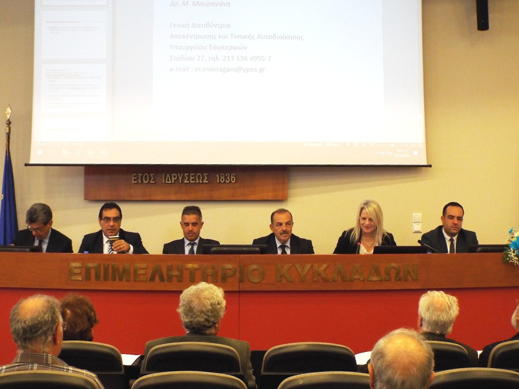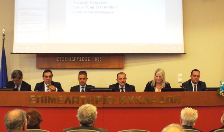 Παρόντες ήταν δήμαρχοι από τις Κυκλάδες και τα Δωδεκάνησα, ενώ το παρών έδωσε και ο κ. Μιχάλης Αγγελόπουλος, Δήμαρχος Σάμου, εκπροσωπώντας το Βόρειο Αιγαίο. Την ανάλυση των νομοθετικών ρυθμίσεων που εισάγονται στο πλαίσιο του “Κλεισθένη”, έδωσε η κ. Μαρία Μαυραγάνη, Γενική Διευθύντρια Αποκέντρωσης και Τοπικής Αυτοδιοίκησης του Υπουργείου Εσωτερικών, η οποία ανέλυσε άρθρο προς άρθρο τις αλλαγές, σε διοικητικό, οικονομικό και ελεγκτικό επίπεδο, που είτε ήδη ισχύουν από την ψήφιση του νόμου, είτε αναμένεται να ισχύσουν με την έναρξη της νέας αυτοδιοικητικής περιόδου.