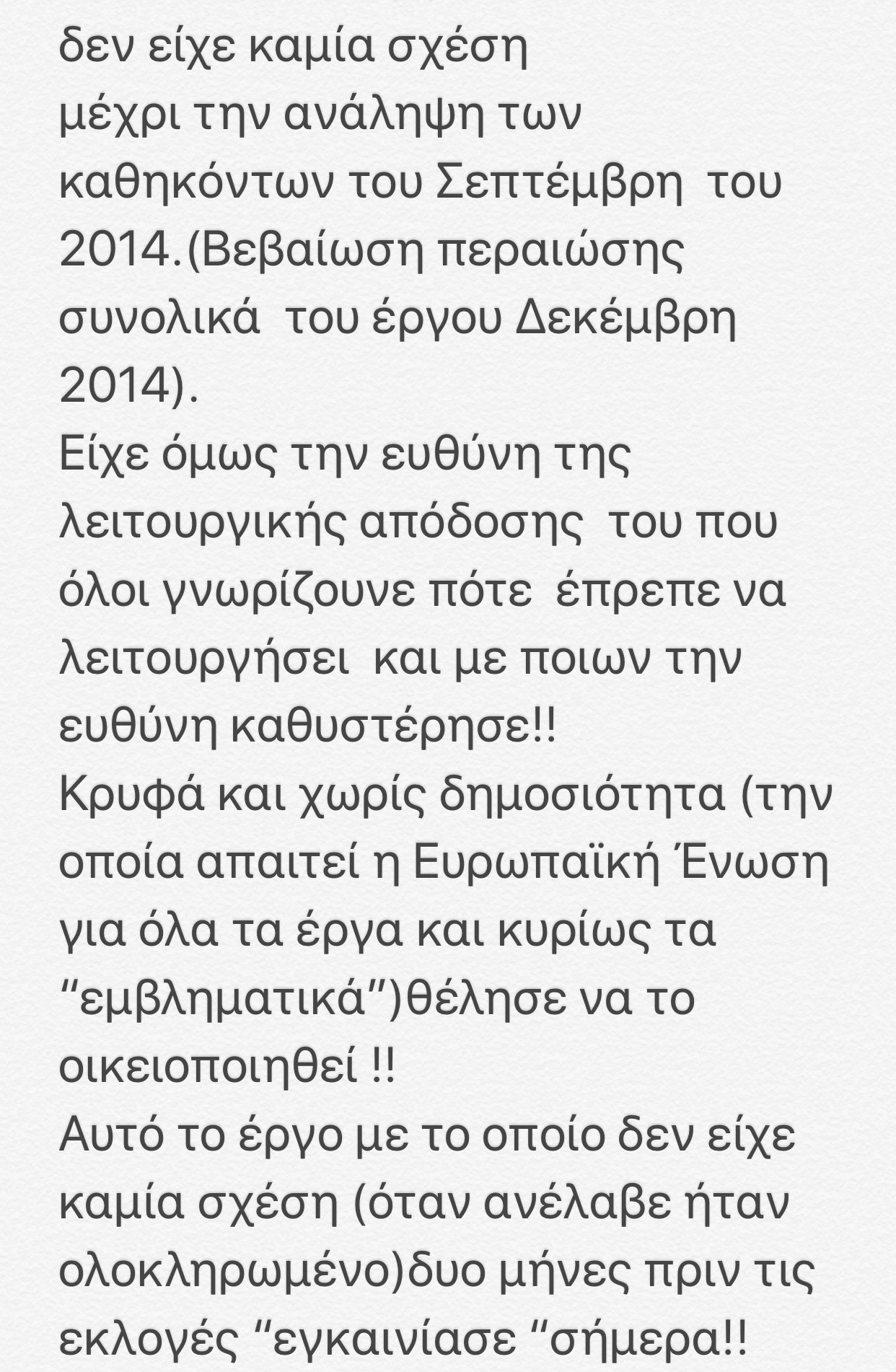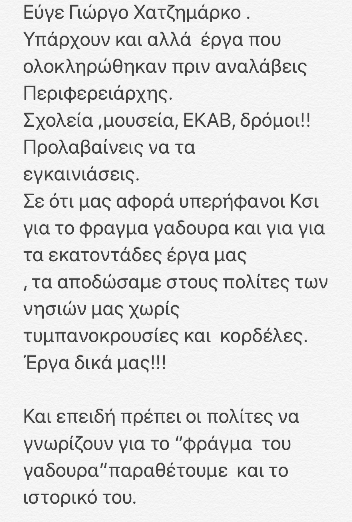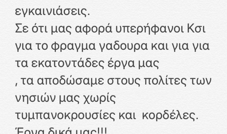 ΑΝΑΛΥΣΗ ΣΥΜΠΕΡΙΦΟΡΑΣ ΠΑΡΑΤΑΞΗΣ «Ν. ΑΙΓΑΙΟ - ΑΡΧΙΠΕΛΑΓΟΣ ΔΗΜΙΟΥΡΓΙΑΣ» ΚΑΙ ΧΡΟΝΙΚΩΝ ΔΕΔΟΜΕΝΩΝ ΟΠΩΣ ΠΡΟΚΥΠΤΟΥΝ ΑΠΟ ΤΑ ΑΝΩΤΕΡΩ ΣΤΟΙΧΕΙΑ Η Παράταξη «Ν. Αιγαίο- Αρχιπέλαγος Δημιουργίας» από τη πρώτη στιγμή είχε υποστηρίξει το έργο της διαχείρισης του Φράγματος Γαδουρά, καθώς επί της δικής της θητείας ως Περιφερειακή Αρχή, το έργο περιήλθε στην ΠΝΑ από τη ΓΓΔΕ - τον Απρίλιο 2014 παραδόθηκε το έργο από τη ΓΓΔΕ, και το Μάιο 2014 έγιναν οι εκλογές στην Περιφέρεια- και παρ ‘όλα αυτά έως και την τελευταία μέρα της θητείας της (31.08.2014), έτρεξε τις διαδικασίες προκειμένου το έργο να ολοκληρωθεί στις 31.12.2014, όπως και έγινε. Το έργο ως φυσικό αντικείμενο ολοκληρώθηκε στις 31.12.2014! Τα μέλη της παράταξης συμμετείχαν σε όλες τις σχετικές διαδικασίες στα αρμόδια συλλογικά όργανα της ΠΝΑ (Περιφερειακό Συμβούλιο και Οικονομική Επιτροπή) και οι παρεμβάσεις τους αποσκοπούσαν πάντα στη διασφάλιση του δημοσίου συμφέροντος και της νομιμότητας. Όπως προκύπτει άλλωστε και από τις αποφάσεις των συλλογικών αυτών οργάνων, επί συνόλου δύο (2) αποφάσεων Περιφερειακού Συμβουλίου και δεκατριών (13) αποφάσεων Οικονομικής Επιτροπής, οι εκπρόσωποι της παράταξης μας διαφοροποιήθηκαν από τις θέσεις της συμπολίτευσης μόνο σε τρεις (3) αποφάσεις της Οικονομικής Επιτροπής , εκ των οποίων στις δυο περιπτώσεις η διαφοροποίηση αφορούσε το ότι τα σχετικά έγγραφα και οι εισηγήσεις τους είχαν χορηγηθεί την ίδια μέρα της συνεδρίασης οπότε δεν υπήρχε χρόνος μελέτης τους, και σε μια, την περίπτωση της απόφασης 616/2016, οι εκπρόσωποι της παράταξης μας συντάχθησαν με την αναλυτική εισήγηση της αρμόδιας Επιτροπής Διαγωνισμού, την οποία δεν υιοθέτησε η συμπολίτευση. Η συγκεκριμένη επιλογή μας στηρίχθηκε στην τεκμηρίωση της Επιτροπής Αξιολόγησης και Ενστάσεων & Προδικαστικών Προσφυγών και επιπλέον τη θεωρήσαμε ασφαλή ως προς το ενδεχόμενο διακοπής λειτουργίας του φράγματος καθώς είχαμε ήδη ψηφίσει (μαζί με τη συμπολίτευση) την παράταση της παλαιάς σύμβασης , άρα υπήρχε πρόβλεψη για την ύπαρξη ανάδοχου για τη λειτουργία του φράγματος έως ότου ολοκληρωθεί η διαδικασία του διεθνούς διαγωνισμού (βλ. κατωτέρω για το θέμα αυτό). Να τονιστεί δε πως η θέση της παράταξης μας για το μέλλον της λειτουργίας του Φράγματος, ήταν η εξής: με ειδική νομοθετική ρύθμιση να αναλάβει τη λειτουργία του η ΔΕΥΑΡ. Άλλωστε, στην υπ’ αρ. Απόφαση 84/23.5.2015, η απόφαση που πάρθηκε έλεγε «πως η Περιφέρεια Νοτίου Αιγαίου θα αποτελέσει τον φορέα «θεσµικής» διαχείρισης, δεδομένου ότι από τους όρους δημοπράτησης και εκτέλεσης του έργου η Περιφέρεια ούτως η άλλως φέρει τη συνολική ευθύνη του έργου και την ευθύνη επίβλεψης της υποχρεωτικής συντήρησης του από τον εργολάβο κατασκευής, µέχρι την 31/12/2017». Οι θέσεις μας υπήρξαν πάντα σαφείς και τεκμηριωμένες. Από την χρονική εξέλιξη και την αλληλουχία των γεγονότων, όπως καταγράφονται ανωτέρω, προκύπτει επίσης με σαφήνεια σε ποιόν ανήκει μεγάλος βαθμός ευθύνης για την δραματική κατάσταση λειψυδρίας που βίωσε το νησί της Ρόδου το καλοκαίρι του 2017. Και πιο συγκεκριμένα: Είναι σαφές ότι μέχρι τον Μάρτιο 2017, η ΠΝΑ προσπαθούσε να διασφαλίσει τη συνέχιση της λειτουργίας του φράγματος Γαδουρά μέσω δυο νομικών οδών: Την παλαιά σύμβαση, μέσω της παράτασης της, και τη νέα σύμβαση που θα προέκυπτε από το διεθνή διαγωνισμό. Αίφνης, και ενώ και οι δυο διαδικασίες (παράταση παλαιάς σύμβασης και ολο