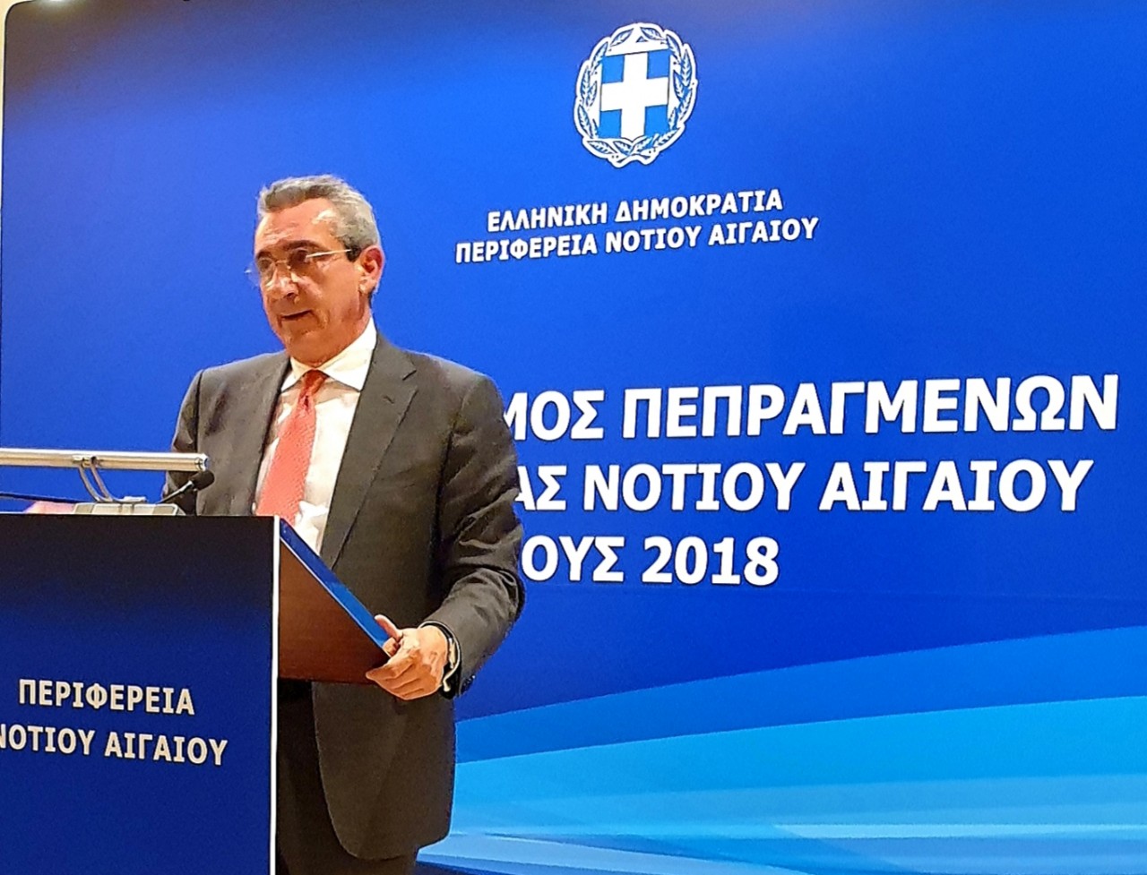 Ο Περιφερειάρχης παρουσίασε αναλυτικά το έργο που παρήχθη τη χρονιά που πέρασε, σε όλους τους τομείς δράσης και παρέμβασης της Περιφέρειας Νοτίου Αιγαίου. Με την ολοκλήρωση της ομιλίας του, είχαν αποτυπωθεί πλήρως σε μετρήσιμα μεγέθη τα αποτελέσματα σε κάθε έναν τομέα ξεχωριστά, με το έτος 2018 να καταγράφεται ως μια ακόμη εξαιρετική περίοδος της πενταετούς θητείας της σημερινής περιφερειακής αρχής, στην διάρκεια της οποίας κορυφώθηκαν και ευοδώθηκαν δύσκολες και χρονοβόρες πρωτοβουλίες που αναλήφθηκαν από το ξεκίνημα της θητείας της, στο πλαίσιο συγκεκριμένης στρατηγικής ανάπτυξης για τα νησιά του Νοτίου Αιγαίου, που δεν εξαντλείται στην λήξη της θητείας, αλλά “προεξοφλεί” ένα περιβάλλον ευκαιριών και δυνατοτήτων και για τα επόμενα χρόνια.