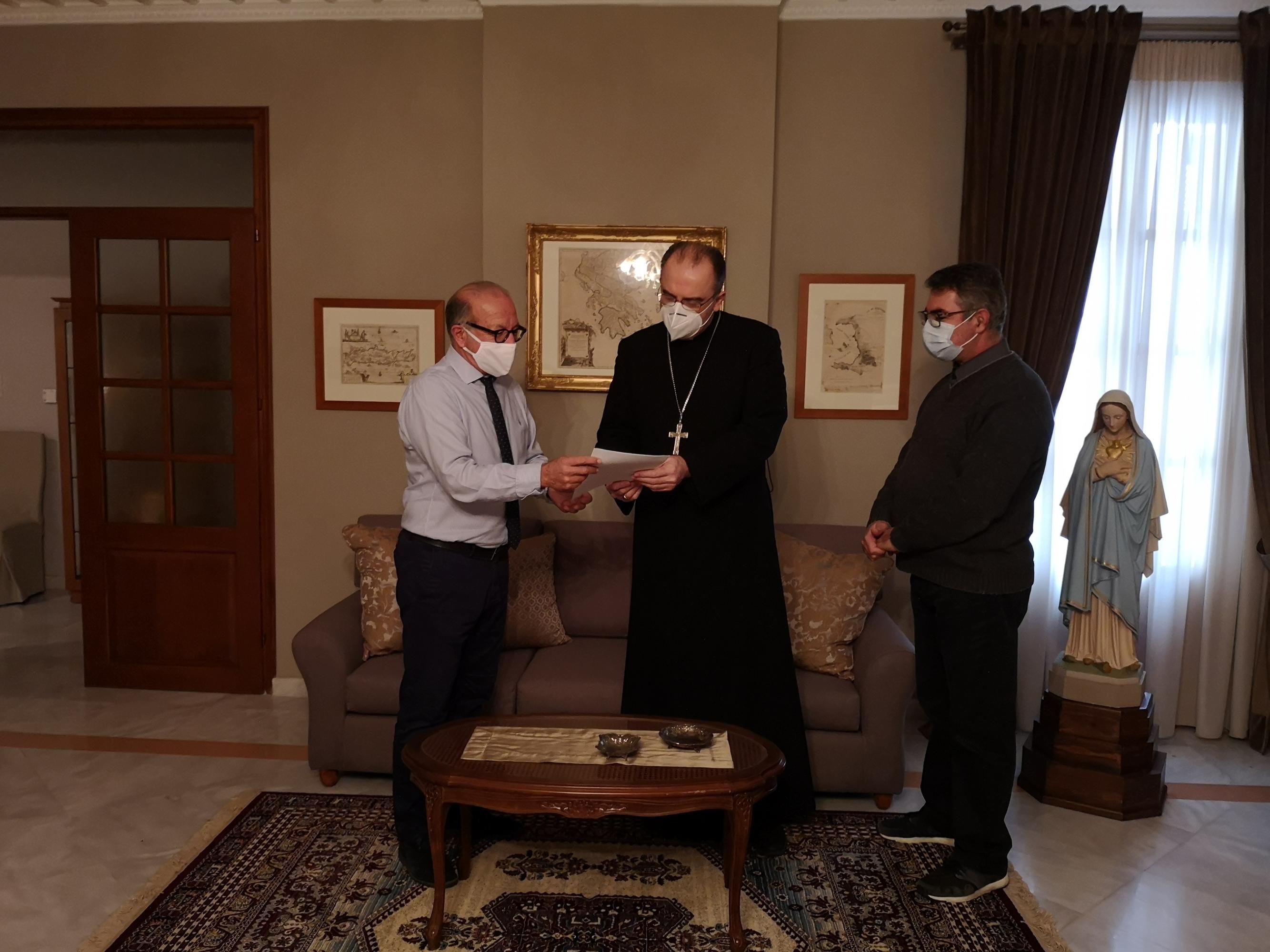 Το Σεβασμιώτατο Καθολικό Επίσκοπο Σύρου π. Πέτρο Στεφάνου επισκέφθηκε σήμερα ο Αντιπεριφερειάρχης Κυκλάδων κ. Γιώργος Λεονταρίτης. Στη συνάντηση παρών ήταν και ο Εφημέριος του Καθεδρικού Ιερού Καθολικού Ναού Αγίου Γεωργίου π. Ιωσήφ.