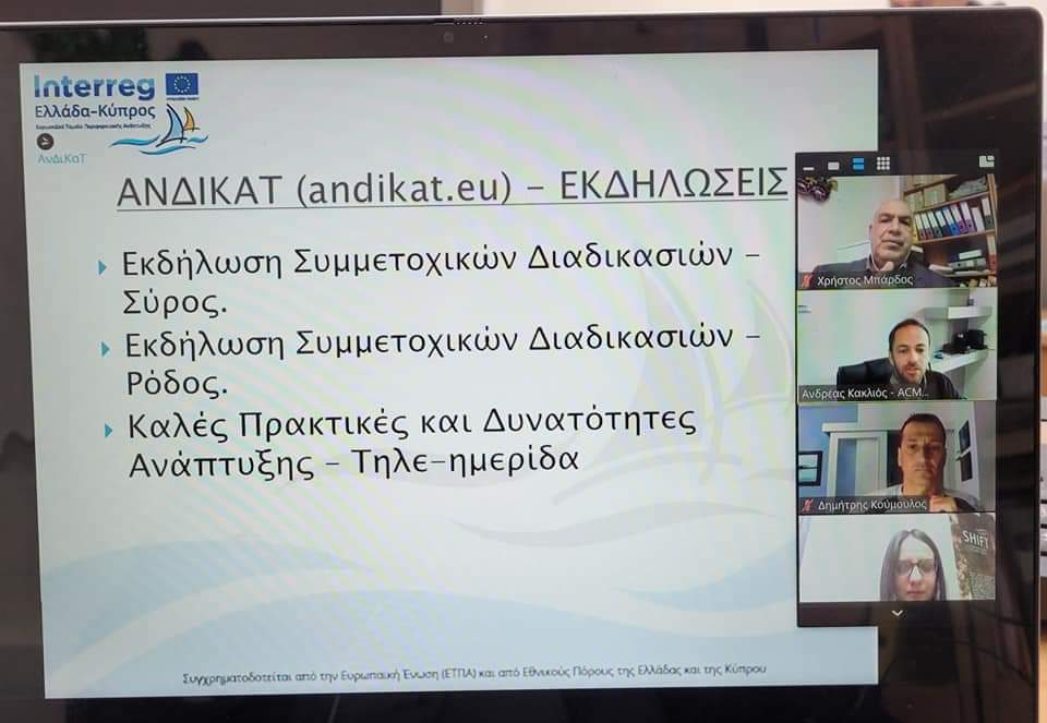 Την Τετάρτη 31 Μαρτίου 2021, ολοκληρώθηκε με επιτυχία, η Τηλε- Ημερίδα που διοργάνωσε η Περιφέρεια Νοτίου Αιγαίου με τίτλο «Καταδυτικός Τουρισμός: Καλές Πρακτικές και Δυνατότητες Ανάπτυξης» στο πλαίσιο της πράξης «ΑΝΔΙΚΑΤ: Καταδυτικές Διαδρομές σε Θαλάσσιες Προστατευόμενες Περιοχές της Ανατολικής Μεσογείου ‐Ανάπτυξη Δικτύου Καταδυτικού Τουρισμού» του Προγράμματος Συνεργασίας Interreg V-A Greece-Cyprus 2014-2020.