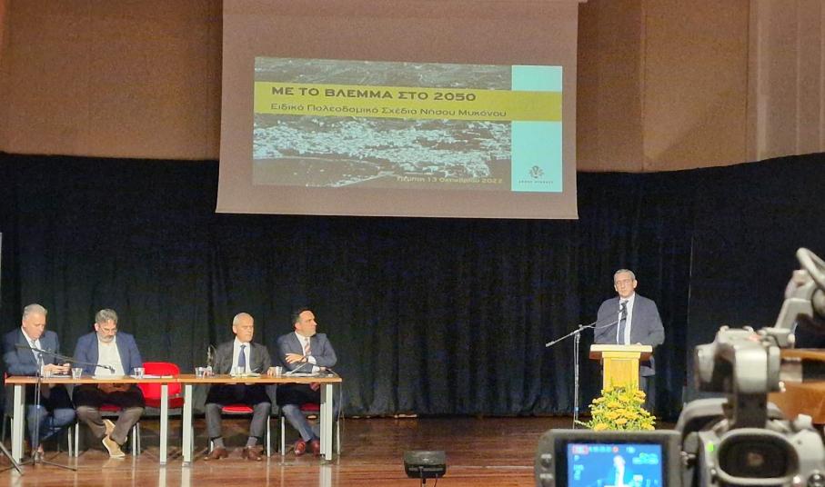 Την παρουσίαση του προγράμματος εκπόνησης του Ειδικού Πολεοδομικού Σχεδίου της Μυκόνου έκανε ο Δημήτρης Σαμαράς, επικεφαλής της αναδόχου ένωσης μελετητών που έχει αναλάβει το έργο, ενώ σχετικά με τη διαμόρφωση κατευθύνσεων πολιτικής για τον χωρικό σχεδιασμό του νησιού στο πλαίσιο του Ειδικού Πολεοδομικού Σχεδίου, μίλησε ο καθηγητής του ΕΜΠ, Κωνσταντίνος Σερράος.