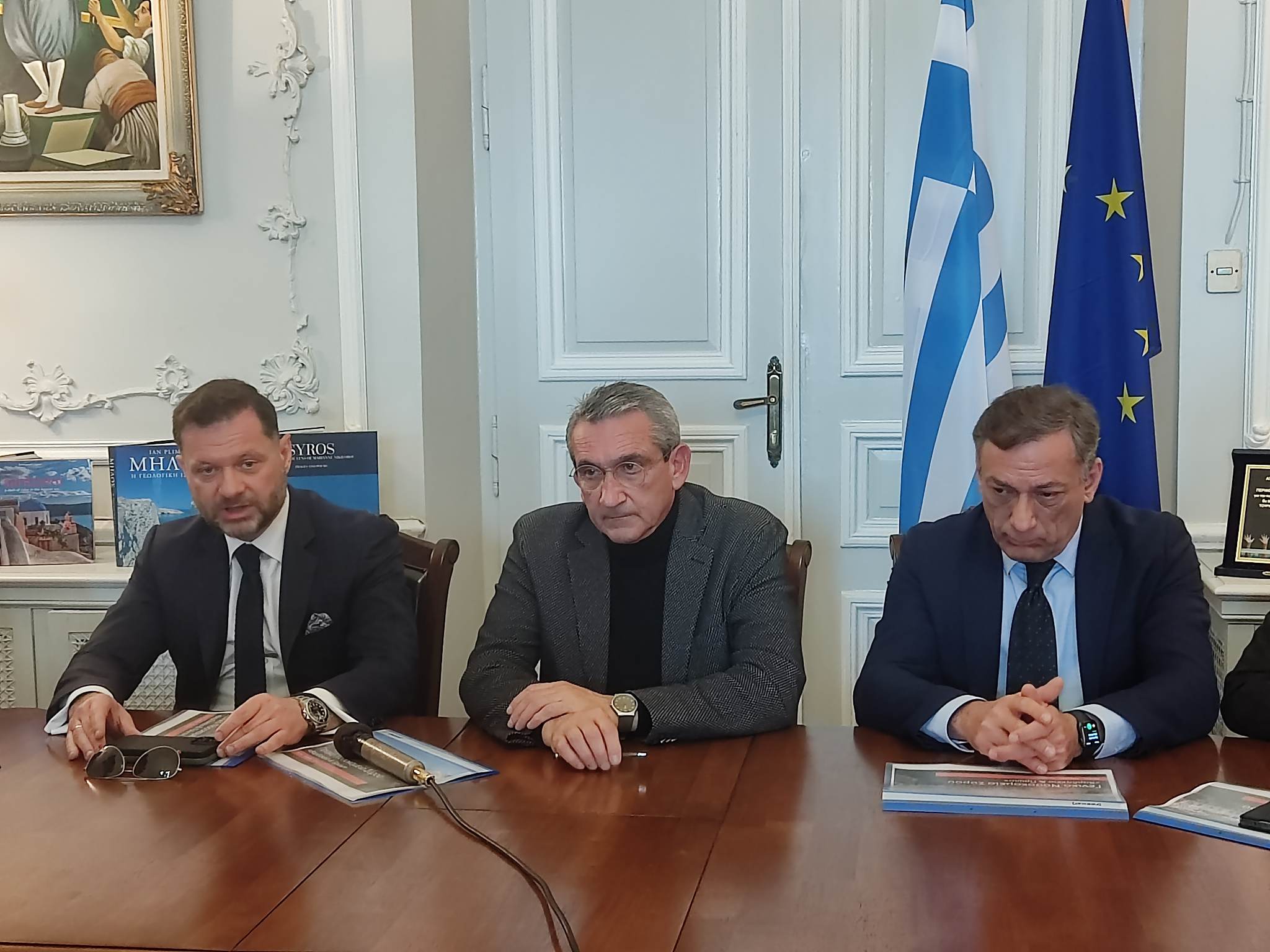 Τόσο για το έργο που έχει παραχθεί για το Νοσοκομείο ώστε αυτό να λειτουργεί έξυπνα, με ασφάλεια και ως μία πράσινη υγειονομική δομή, όσο όμως και για τη λειτουργία του Διεθνούς Κέντρου Θαλάσσιας Τεχνολογίας και Καινοτομίας παραχώρησαν συνέντευξη Τύπου ο Περιφερειάρχης Ν. Αιγαίου, Γιώργος Χατζημάρκος, ο πρόεδρος του Ομίλου ONEX, Πάνος Ξενοκώστας, ο Γενικός Διευθυντής της CISCO για Ελλάδα, Μάλτα και Κύπρο, Αντώνης Τσιμπούκης, ο Διοικητής της 2ης ΥΠΕ Πειραιώς και Αιγαίου, Χρήστος Ροΐλός, ο Αντιπεριφερειάρχης Κυκλάδων, Γιώργος Λεονταρίτης και η Πρυτάνισσα του Πανεπιστημίου Αιγαίου, Χρυσή Βιτσιλάκη.