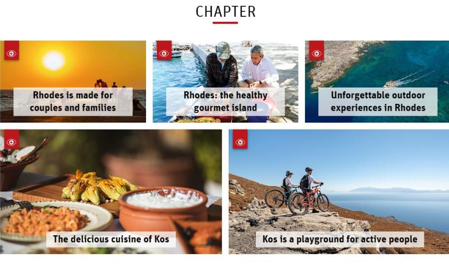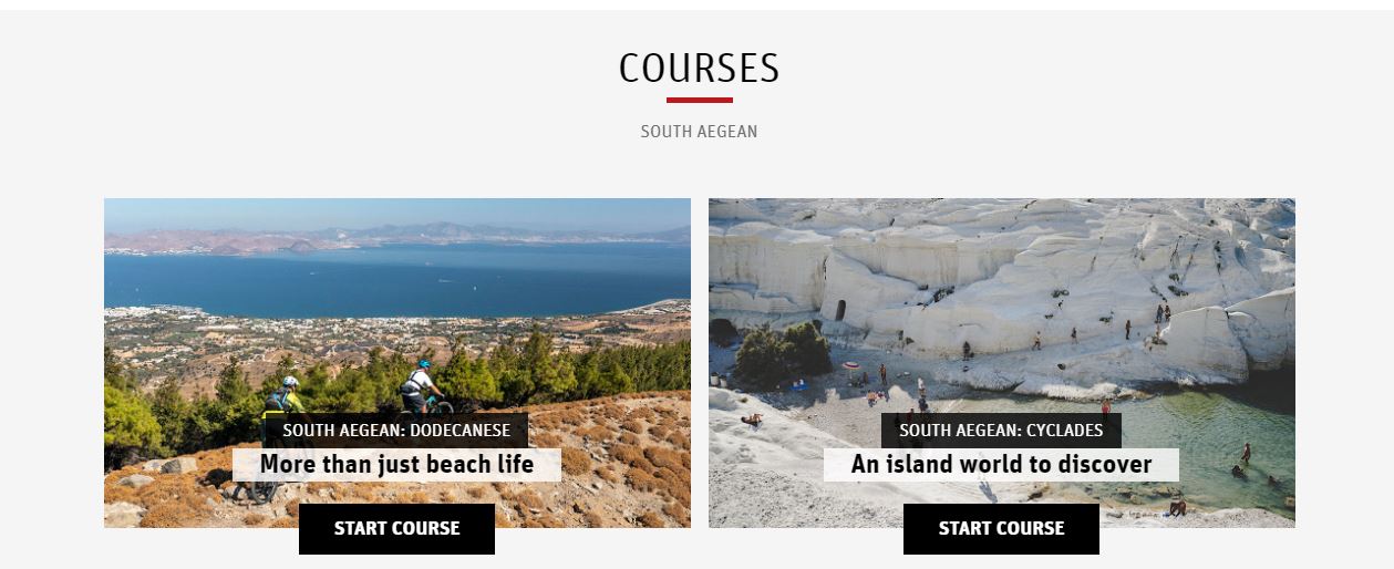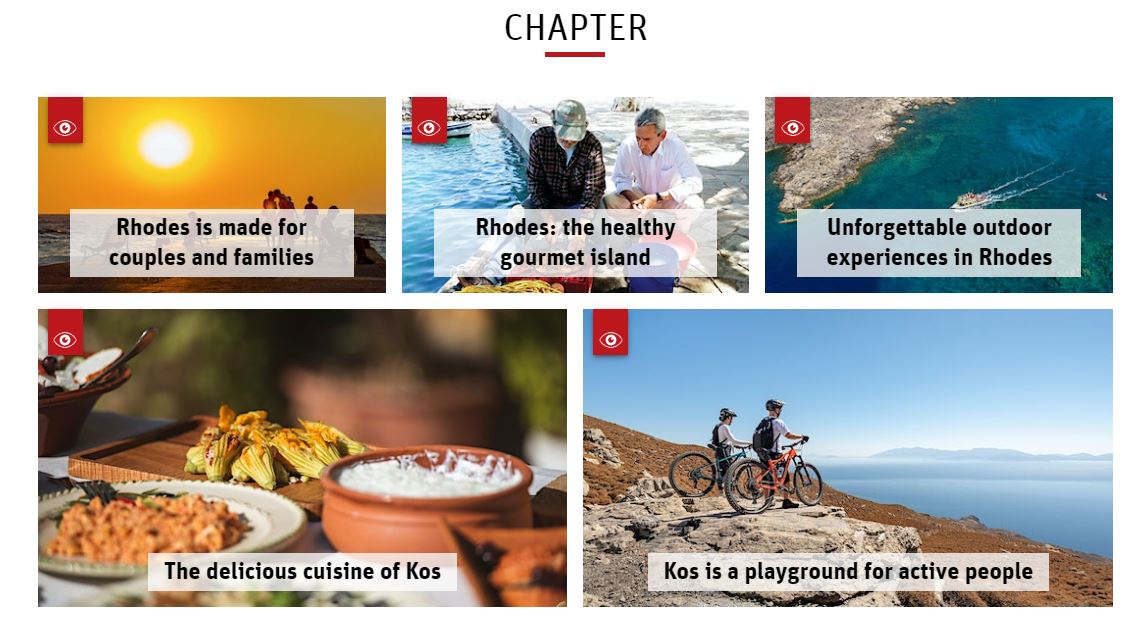 Για τα Δωδεκάνησα, στην πρώτη φάση της εκπαιδευτικής δράσης παρουσιάζονται η Ρόδος και η Κως, μέσα από την εκπαιδευτική ενότητα με τίτλο "More than just beach life", η οποία περιέχει πέντε θεματικές: "Rhodes is made for couples and families", "Rhodes: the healthy gourmet island", "Unforgettable outdoor experiences in Rhodes", "The delicious cuisine of Kos" και "Kos is a playground for active people".