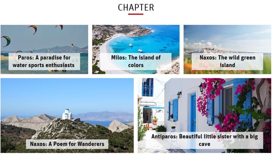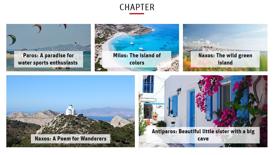 Το ψηφιακό εκπαιδευτικό υλικό που δημιουργήθηκε για τα νησιά της Περιφέρειας Νοτίου Αιγαίου απαρτίζεται από πέντε θεματικές ενότητες για τα Δωδεκάνησα και πέντε για τις Κυκλάδες. Για τις Κυκλάδες, στην πρώτη φάση της εκπαιδευτικής δράσης παρουσιάζονται τα νησιά Νάξος, Πάρος, Μήλος και Αντίπαρος μέσα από την εκπαιδευτική ενότητα με τίτλο «An island world to discover", η οποία περιέχει πέντε θεματικές: "Paros: A paradise for sports enthusiasts", "Milos: The island of colors", "Naxos: The wild green island", "Naxos: A poem for wanderers", και "Antiparos: Beautiful little sister with a big cave".