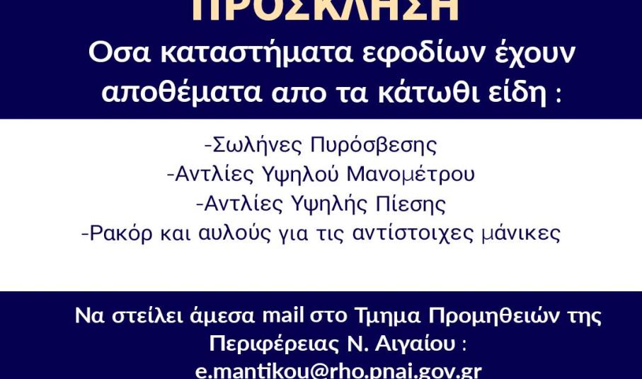 Παράλληλα, και δεδομένου ότι η δασική πυρκαγιά συνεχίζει το καταστροφικό της έργο, η Περιφέρεια Νοτίου Αιγαίου απευθύνει νέα πρόσκληση σε όσα καταστήματα εφοδίων έχουν αποθέματα από τα παρακάτω είδη: