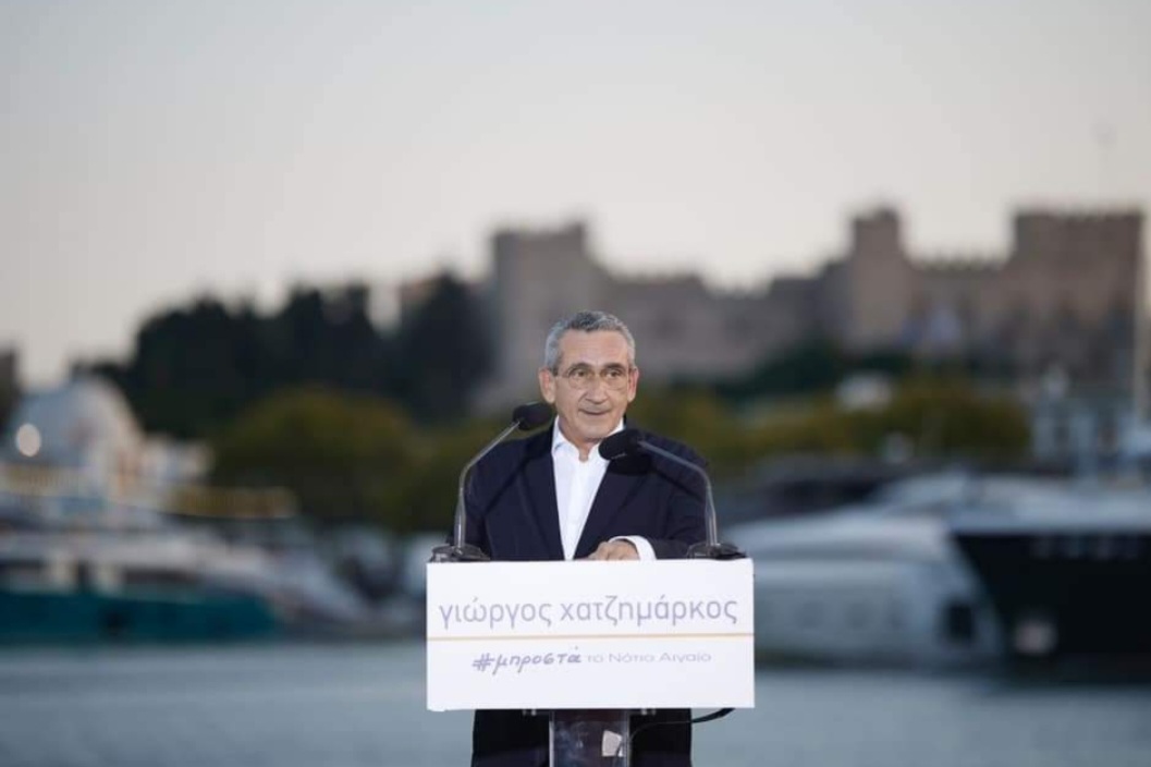 Ο Πρωθυπουργός δήλωσε την αμέριστη στήριξή του στο πρόσωπο του Περιφερειάρχη Γιώργου Χατζημάρκου. Απευθυνόμενος στο ακροατήριό του, ο κ. Μητσοτάκης είπε: «Έχετε την τύχη να έχετε ήδη δοκιμάσει έναν εξαιρετικό περιφερειάρχη, ο οποίος έχει αφήσει το αποτύπωμά του σε όλα τα νησιά του Νοτίου Αιγαίου. Έναν άνθρωπο με τον οποίο, ως κυβέρνηση έχουμε συνεργαστεί άψογα. Έναν άνθρωπο που διαχειρίζεται το εξαιρετικά σύνθετο έργο μιας μεγάλης και πολυποίκιλης νησιωτικής Περιφέρειας με αποτελεσματικότητα και με απόλυτη αφοσίωση στον στόχο του. Είναι ο κατάλληλος άνθρωπος στην κατάλληλη θέση». Αναφερόμενος στην επόμενη 5ετή αυτοδιοικητική θητεία, ο Πρωθυπουργός ανακοίνωσε ότι πέραν των αυξημένων χρηματοδοτήσεων μέσα από τα ευρωπαϊκά προγράμματα, η Περιφέρεια Νοτίου Αιγαίου θα έχει στη διάθεσή της ένα Ειδικό Αναπτυξιακό Πρόγραμμα του ΠΔΕ, ύψους 172 εκατ. €.