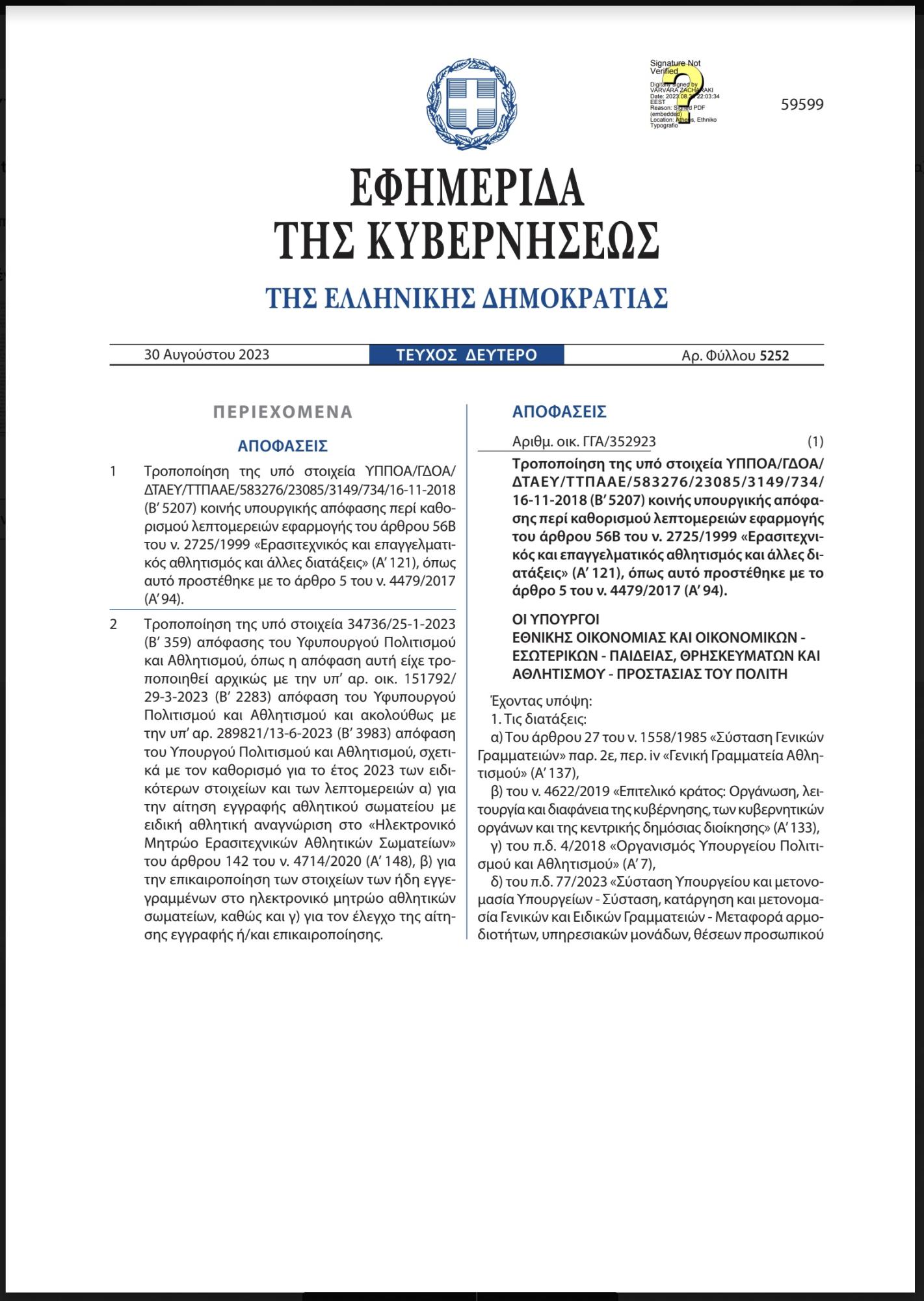 Επισυνάπτεται η σχετική υπουργική απόφαση, προς τροποποίηση της υπό στοιχεία ΥΠΠΟΑ/ΓΔΟΑ/ ΔΤΑΕΥ/ΤΤΠΑΑΕ/583276/23085/3149/734/ 16-11-2018 (Β’ 5207) κοινής υπουργικής απόφασης περί καθορισμού λεπτομερειών εφαρμογής του άρθρου 56Β του ν. 2725/1999 «Ερασιτεχνικός και επαγγελματικός αθλητισμός και άλλες διατάξεις» (Α’ 121), όπως αυτό προστέθηκε με το άρθρο 5 του ν. 4479/2017 (Α’ 94,
