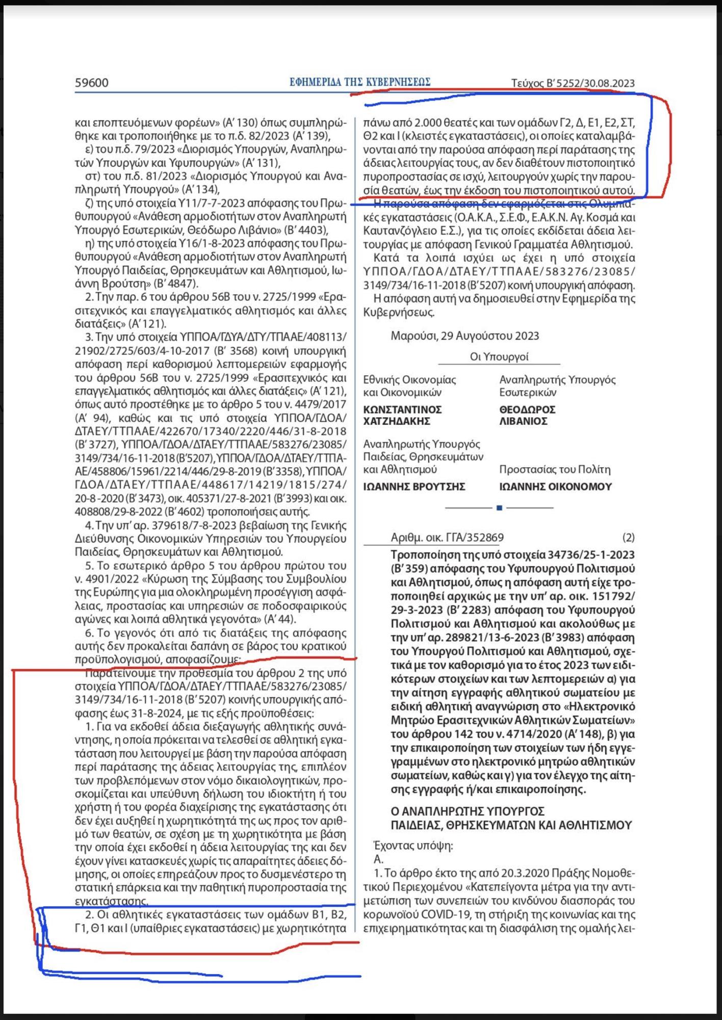 Σύμφωνα με την κοινή υπουργική απόφαση την οποία συνυπογράφουν οι υπουργοί Εθνικής Οικονομίας και Οικονομικών, Κωστής Χατζηδάκης, ο Αναπληρωτής Υπουργός Εσωτερικών, Θεόδωρος Λιβάνιος, ο Αναπληρωτής Υπουργός Παιδείας, Θρησκευμάτων και Αθλητισμού, Γιάννης Βρούτσης και ο Υπουργός Προστασίας του Πολίτη, Γιάννης Οικονόμου, και η οποία δημοσιεύθηκε στο ΦΕΚ Τεύχος Β΄5252 της 30ης Αυγούστου 2023, τίθεται ως βασική προϋπόθεση για την παράταση της άδειας λειτουργίας αθλητικών εγκαταστάσεων με χωρητικότητα άνω των 2.000 ατόμων, η έκδοση ξεχωριστού πιστοποιητικού πυρασφάλειας. Ειδικότερα, η απόφαση αναφέρει ότι αν οι αθλητικές εγκαταστάσεις δεν διαθέτουν πιστοποιητικό πυρασφάλειας σε ισχύ, λειτουργούν χωρίς την παρουσία θεατών, έως την έκδοση του πιστοποιητικού αυτού.