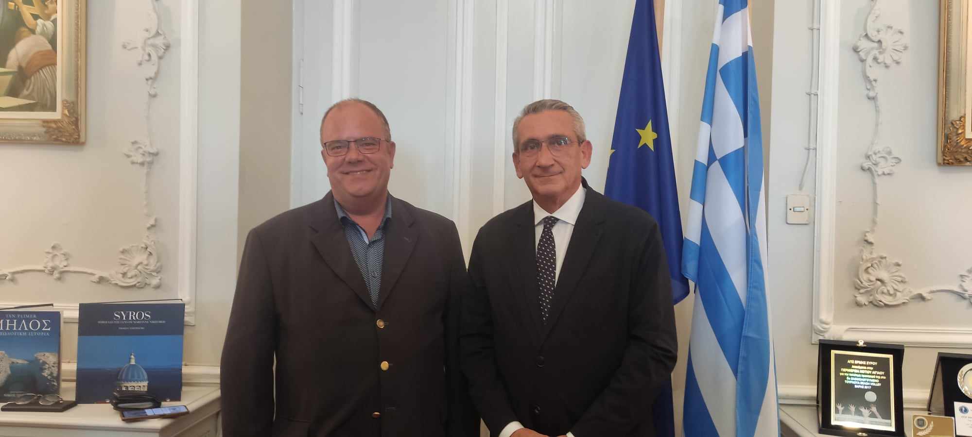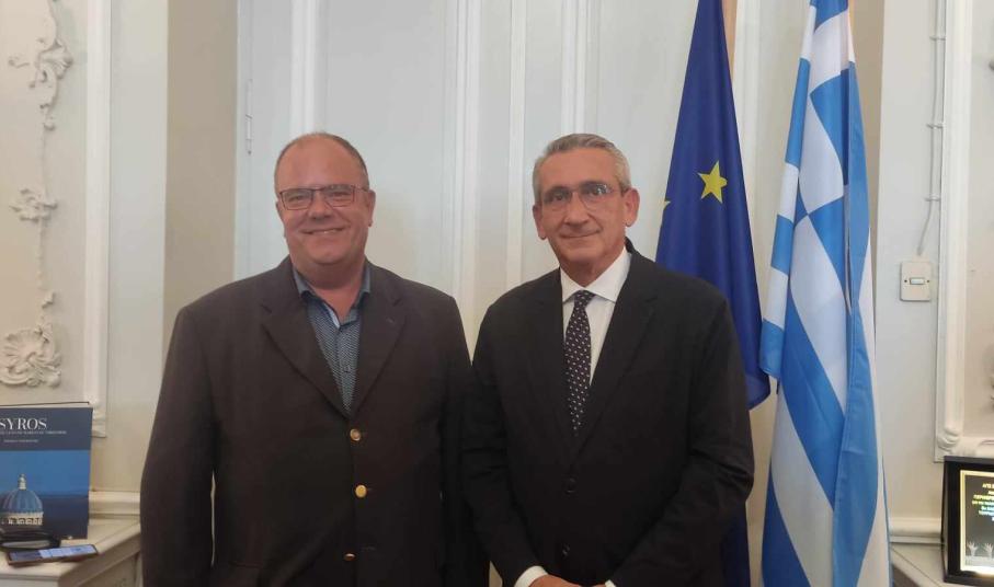 Αμέσως μετά τη συνέντευξη Τύπου, στην Περιφέρεια στη Σύρο μετέβη ο νέος δήμαρχος Σύρου – Ερμούπολης, Αλέξης Αθανασίου, ο οποίος συνεχάρη τον κ. Χατζημάρκο για το εκλογικό αποτέλεσμα και ο περιφερειάρχης με τη σειρά του, εξήγησε πως επιθυμεί να έχουν διάλογο και καλή συνεργασία. “Σε θεσμικό επίπεδο παραμένει η καλύτερη και η υψηλότερη συνεργασία με τους Δήμους”, ανέφερε πρωτίστως ο Γιώργος Χατζημάρκος για τη συνεργασία με τον α΄ βαθμό αυτοδιοίκησης, τονίζοντας πως η συνάντησή του με τον κ. Αθανασίου πραγματοποιείται για να τεθεί αρχικά μία βάση επικοινωνίας, ενόψει της επίσημης ανάληψης των καθηκόντων του στον Δήμο Σύρου – Ερμούπολης από 1η Ιανουαρίου.