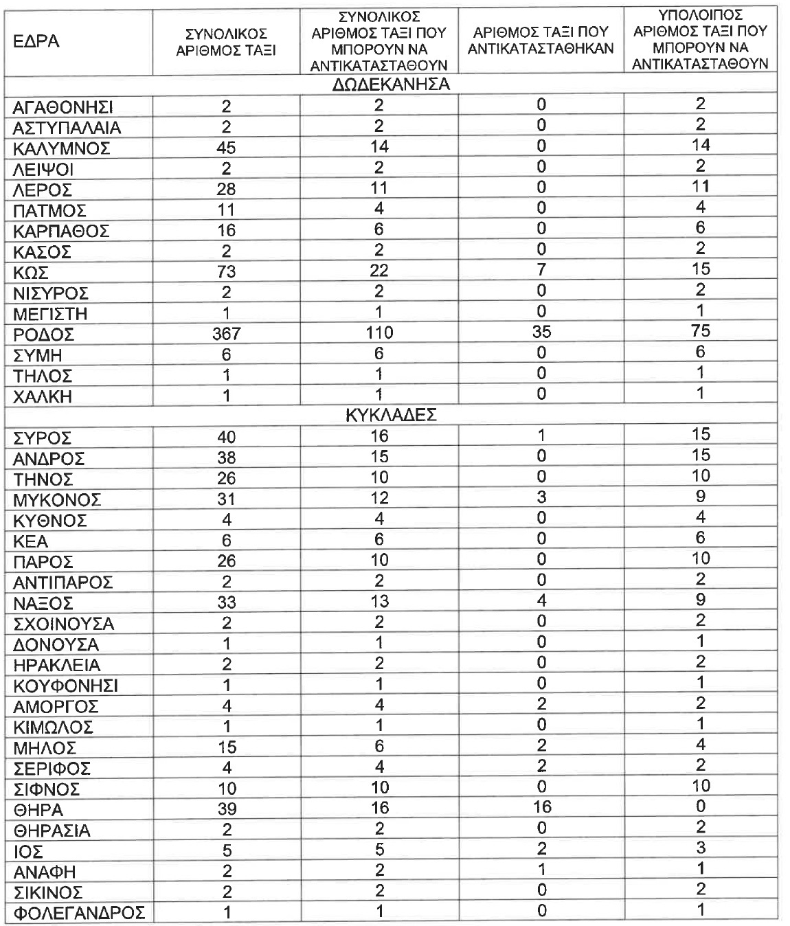 Ειδικότερα, ο αριθμός των Ε.Δ.Χ. ΤΑΞΙ αυτοκινήτων τα οποία μπορούν να αντικατασταθούν σε κάθε έδρα, αποτυπώνεται στον σχετικό πίνακα: