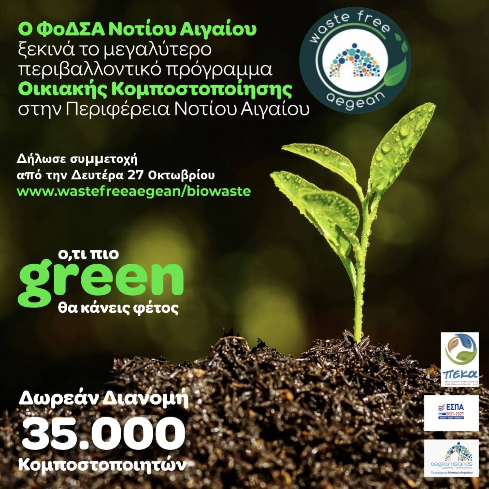 Ό,τι πιο green θα κάνεις φέτος ξεκινά την Δευτέρα 27 Οκτωβρίου 2025, στις 09:00, όπου οι πολίτες της Περιφέρειας Νοτίου Αιγαίου μπορούν να δηλώσουν συμμετοχή στο μεγαλύτερο πρόγραμμα οικιακής κομποστοποίησης και να διεκδικήσουν την απόκτηση του δικού τους οικιακού κομποστοποιητή εντελώς δωρεάν.