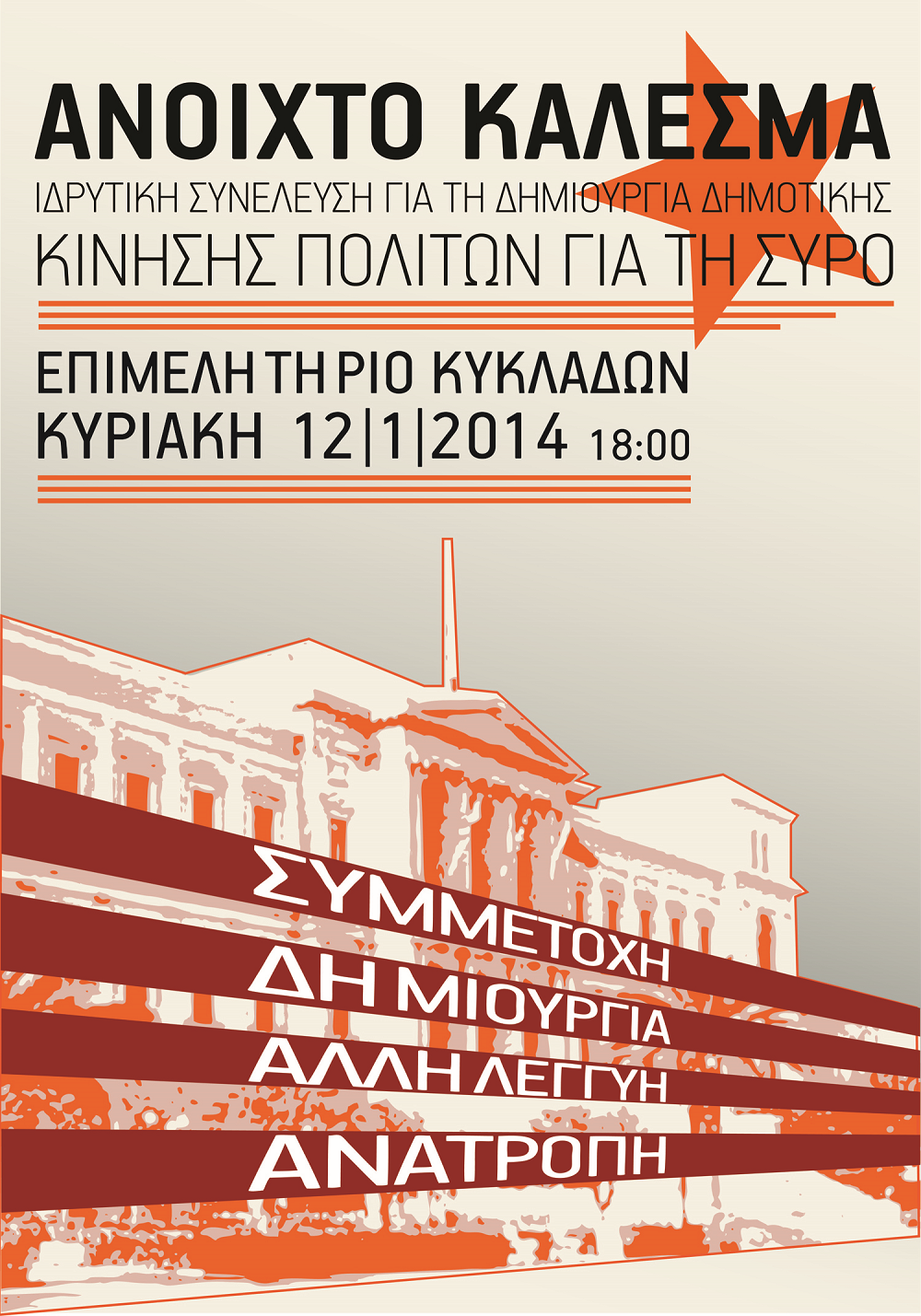 Ανοιχτό κάλεσμα σε όσους επιθυμούν να συμμετάσχουν στη δημιουργία μίας νέας δημοτικής κίνησης με κύρια συστατικά τη συμμετοχή, τη δημιουργία, την αλληλεγγύη και την ανατροπή απευθύνει ο χώρος της κεντροαριστεράς στη Σύρο μετά από απόφαση και πρωτοβουλία του Σύριζα.