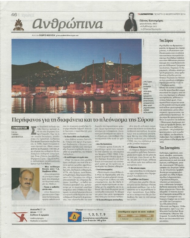 Προσωπική συνέντευξη του δημάρχου Σύρου – Ερμούπολης Γιάννη Δεκαβάλλα φιλοξενείται στην εφημερίδα “Ελευθεροτυπία”, η οποία δημοσιεύθηκε στο σημερινό φύλλο και παραχωρήθηκε στον δημοσιογράφο Γιώργο Κιούση.