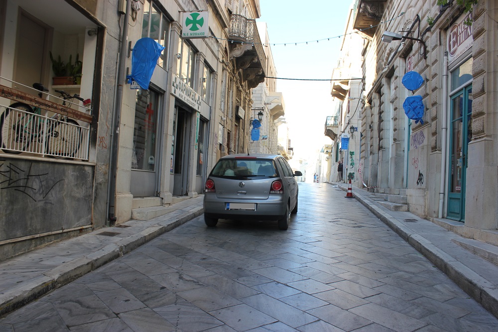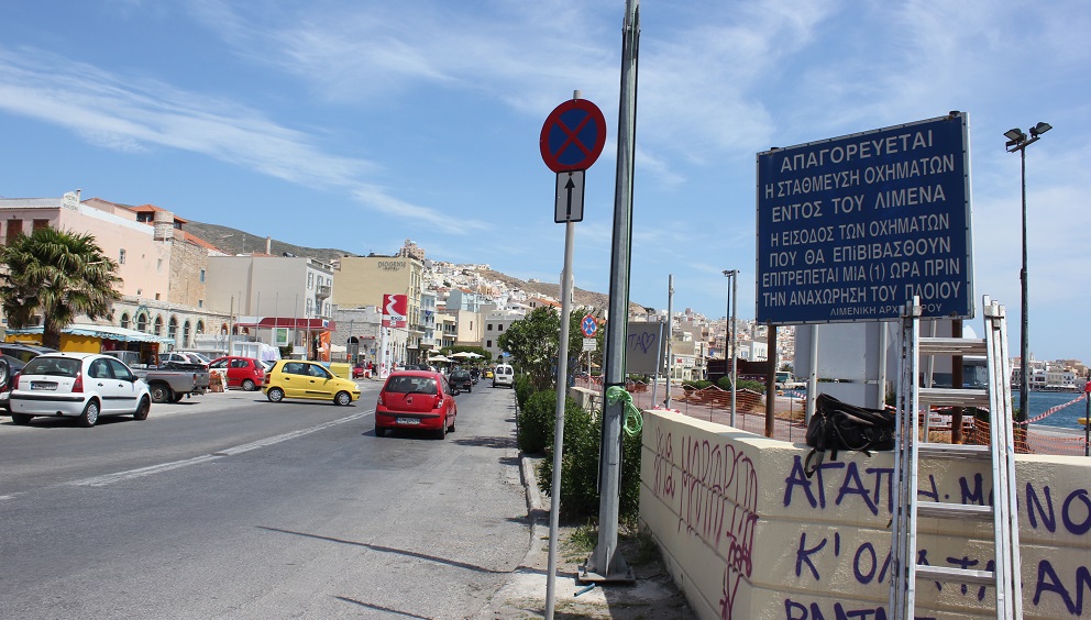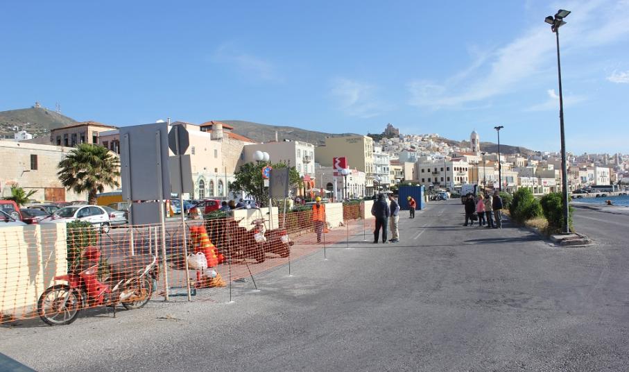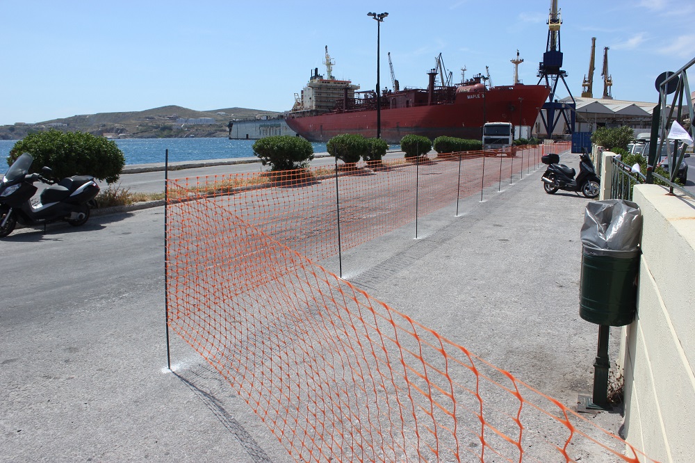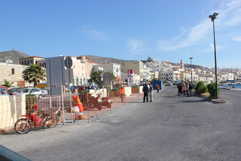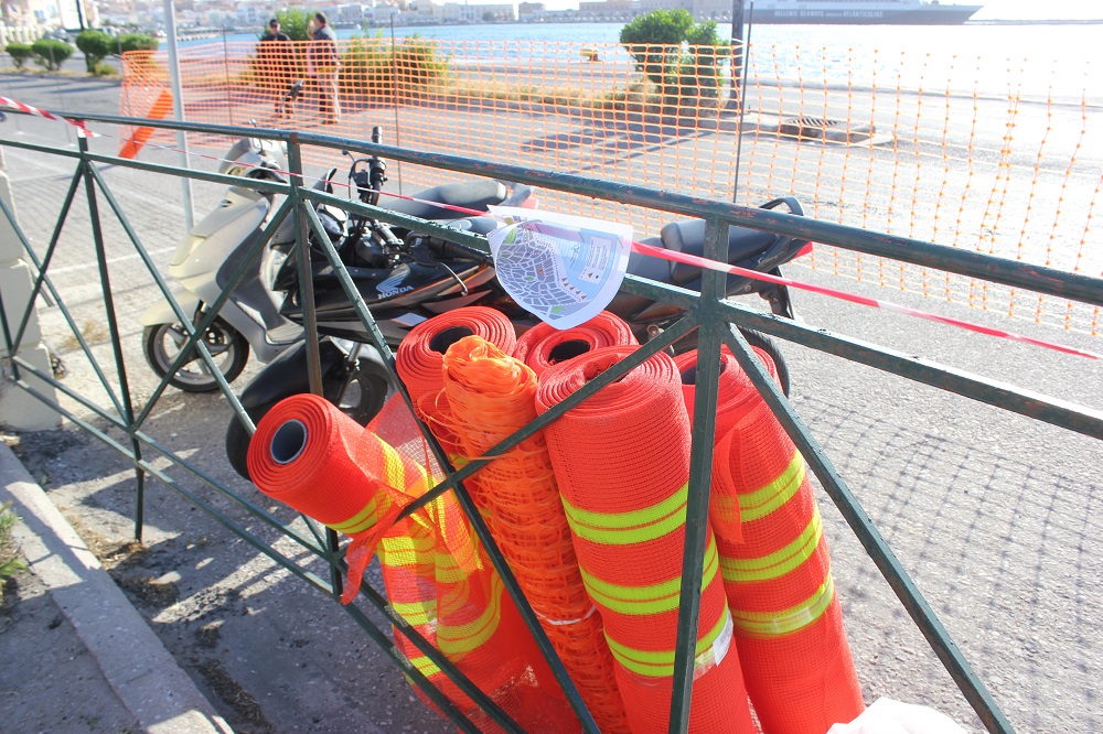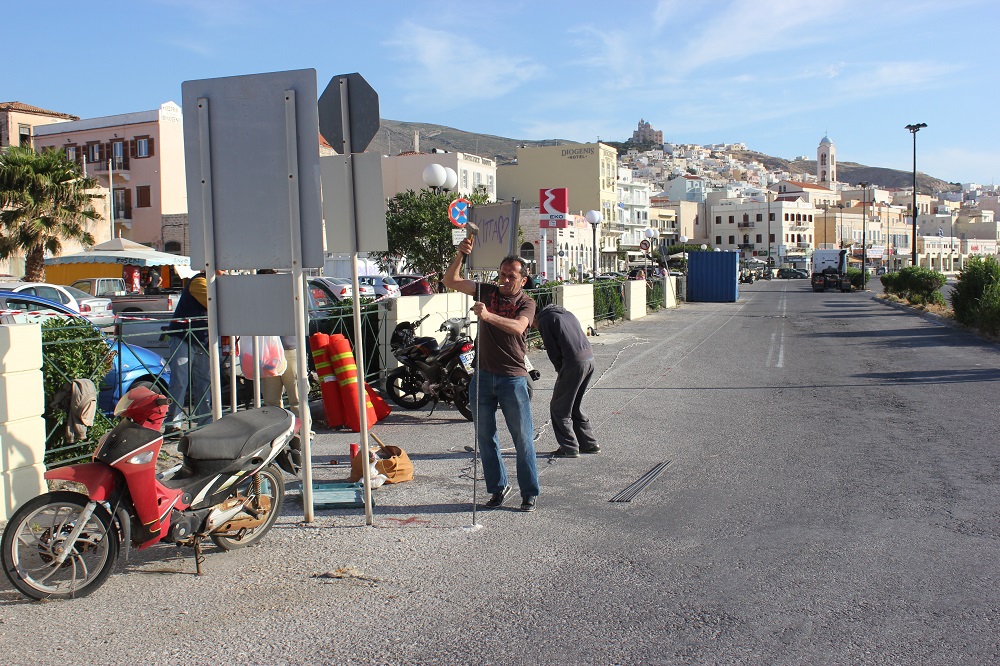 Κατά μήκος της παραλιακής ζώνης στη νησίδα και στα κιγκλιδώματα έχουν τοποθετηθεί ειδικές ταινίες απαγόρευσης της στάσης και της στάθμευσης των οχημάτων και των δικύκλων, ενώ αξίζει να τονισθεί ότι από τη Σταματίου Πρωίου έχουν αποχωρήσει όλα τα σταθμευμένα μέσα μεταφοράς που υπήρχαν με την πολύτιμη συνδρομή ατόμων του Δήμου. Ομαλά εκτελεί τα δρομολόγια η δημοτική συγκοινωνία με τα mini bus να εξυπηρετούν τους πολίτες από και προς τα νέα σημεία στάσης στη Σταματίου Πρωίου, ενώ οι πινακίδες σήμανσης έχουν καλυφθεί με νάιλον σακούλες. Επιπλέον, από το παραλιακό μέτωπο άνδρες του Δήμου Σύρου – Ερμούπολης έχουν προβεί στην αφαίρεση των φωτιστικών σημείων. Διακριτική είναι και η παρουσία ανδρών της Αστυνομίας.