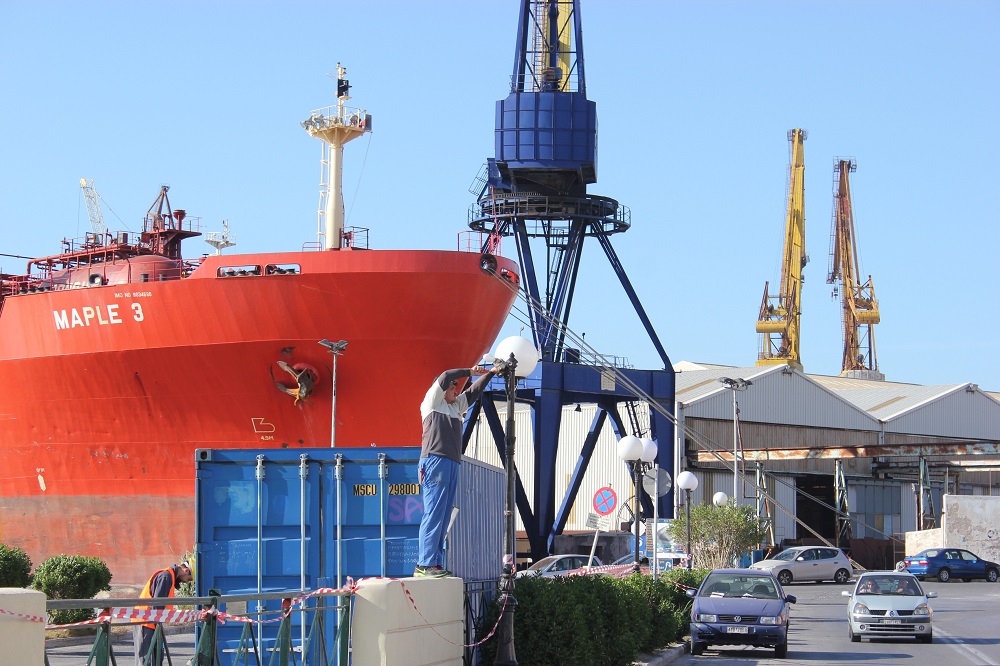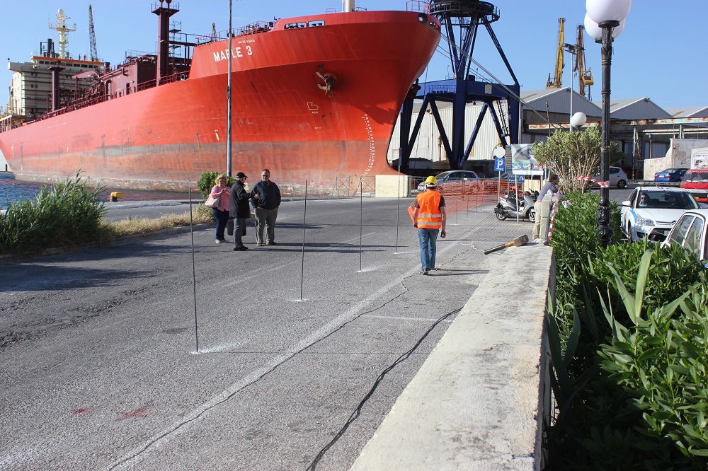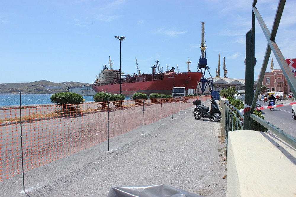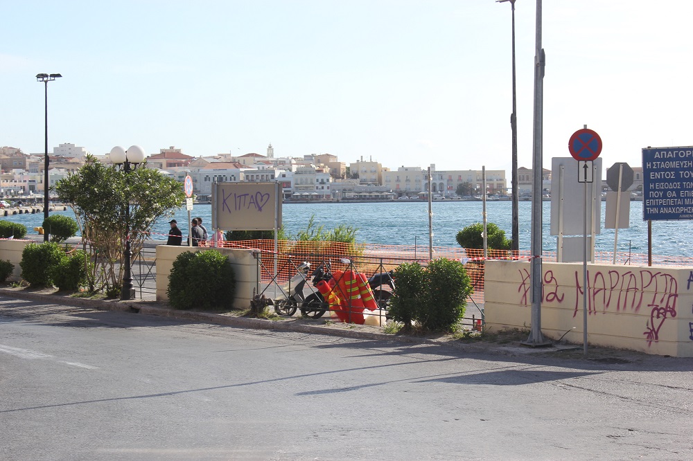 Σε πρώτο επίπεδο οι εργάτες οριοθετούν το χώρο που θα συντελεστούν οι εργασίες στο εσωτερικό τμήμα του λιμένα της Ερμούπολης τοποθετώντας τον απαιτούμενο εξοπλισμό προκειμένου σταδιακά να προχωρήσουν στην υλοποίηση της Α΄ Φάσης του έργου.