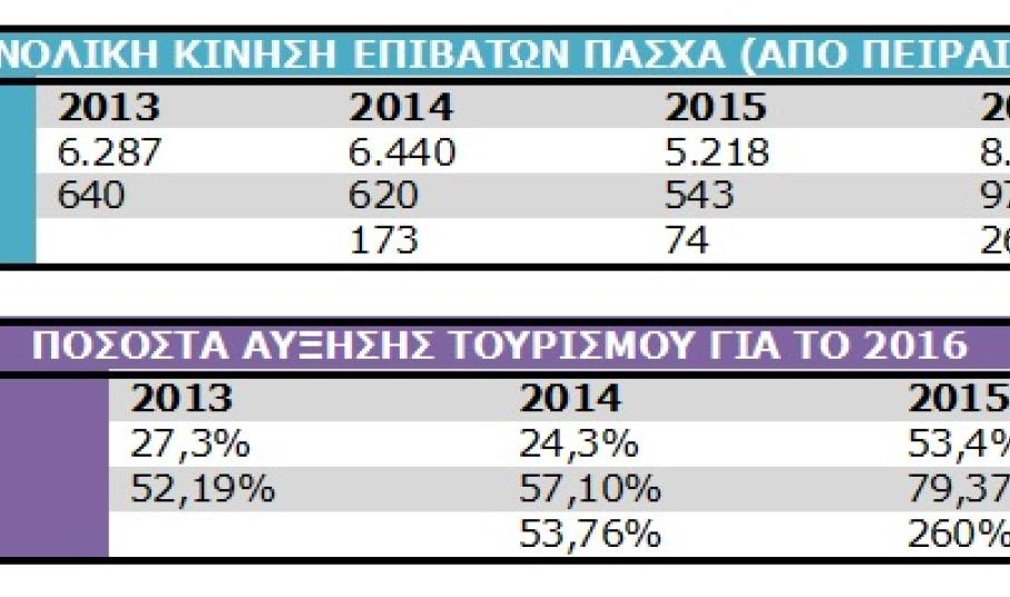 Ενδεικτικά, παραθέτουμε τα επίσημα στοιχεία του Λιμεναρχείου Σύρου, αναφορικά με την τουριστική κίνηση των τελευταίων χρόνων, κατά τη διάρκεια της Μεγάλης Εβδομάδας, καθώς και τα ποσοστά αύξησης του αριθμού των επιβατών, των Ι.Χ. και των δικύκλων για το 2016 σε σχέση με το 2013, το 2014 και το 2015.