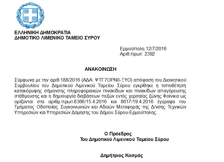Τονίζεται πως, η πρόταση έχει διαβιβασθεί και στο Δημοτικό Λιμενικό Ταμείο Σύρου, καθώς αποτελεί το αρμόδιο όργανο για τη λήψη αποφάσεων και γνωμοδοτήσεων σε ζώνες αρμοδιότητάς του. Για το σύνολο των εργασιών κατά μήκος της παραλιακής οδού του Φοίνικα οι δαπάνες θα βαρύνουν κωδικό του προϋπολογισμού του Δήμου.