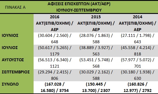 Ειδικότερα, σύμφωνα με τα επίσημα στοιχεία, η επισκεψιμότητα στον Λιμένα Ερμούπολης και τον Αερολιμένα Σύρου, για τους μήνες Ιούνιο, Ιούλιο, Αύγουστο και Σεπτέμβριο (ανά μήνα και συνολικά) παρουσιάζονται στον ακόλουθο Πίνακα Α. Ομοίως, τα στοιχεία επισκεψιμότητας στον τομέα της κρουαζιέρας (επιβάτες, πλοία) παρουσιάζονται στον ακόλουθο Πίνακα Β και τέλος, τα στοιχεία επισκεψιμότητας τουριστικών σκαφών και σκαφών αναψυχής, για τον λιμένα Ερμούπολης και τον Φοίνικα, παρουσιάζονται στον ακόλουθο Πίνακα Γ.