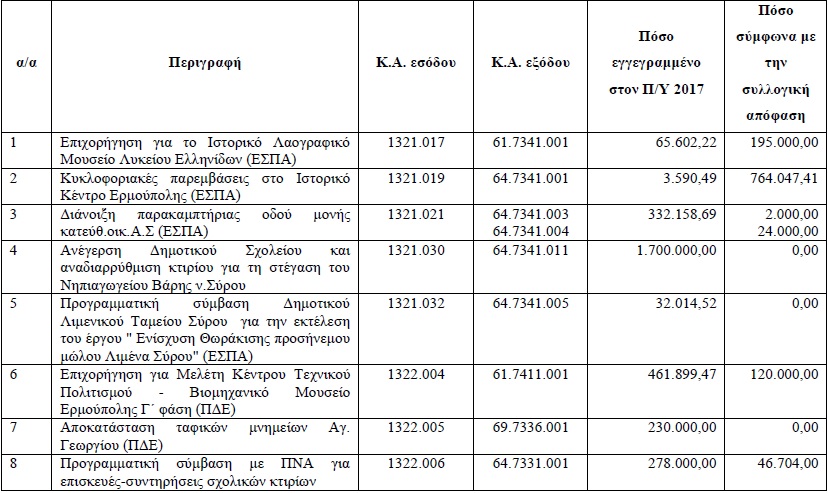 Ειδικότερα, η ΑΔΑ στην απόφασή της επισημαίνει πως, “επικυρώνει την αριθμ 539/2016 (ΑΔΑ: 7ΓΩΡΩΗΟ-ΓΤΡ) απόφαση του Δημοτικού Συμβουλίου Δήμου Σύρου - Ερμούπολης αναφορικά με την «Έγκριση Δήμου Σύρου Ερμούπολης Ο.Ε. 2017 και ψήφιση Ολοκληρωμένου Πλαισίου Δράσης του»” υπό την προϋπόθεση και “τον όρο της τήρησης της νόμιμης διαδικασίας για κάθε Κωδικό Αριθμό Εξόδου και της αρχής της ειδικότητας επί όλων των προϋπολογισθέντων και αναφερόμενων στον παρόντα προϋπολογισμό πιστώσεων”. Συγκεκριμένα, πέραν της παρατήρησης για την εγγραφή της πίστωσης για την κάλυψη των δαπανών των προνοιακών επιδομάτων των Δήμων των Κυκλάδων, καθώς ο Δήμος Σύρου – Ερμούπολης είναι Μητροπολιτικός Δήμος, γίνεται αναφορά και στην απαίτηση καταγραφής των ετήσιων πιστώσεων για ορισμένα έργα και όχι της συνολικής δαπάνης τους. Ως εκ τούτου, υπογραμμίζεται ότι, “θα πρέπει στην α’ αναμόρφωση του προϋπολογισμού να διαμορφώσετε (σσ. ο Δήμος) ισόποσα τις έγγραφες σύμφωνα με την συλλογική απόφαση του 2016” όπως υποδεικνύονται στον σχετικό πίνακα.