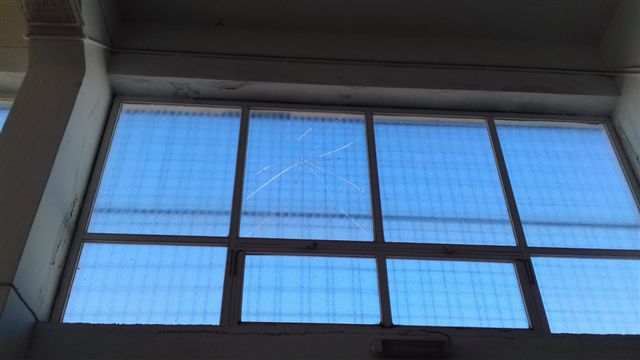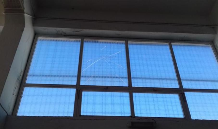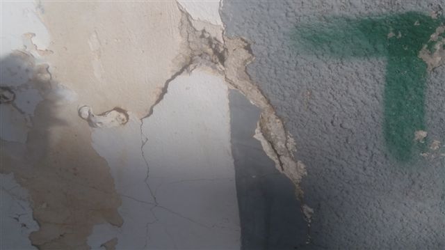 «1. Στην κλειστή αίθουσα γυμναστικής υπάρχουν εκτεταμένες αποκολλήσεις του επιχρίσματος και τμημάτων της επικάλυψης από σκυρόδεμα του οπλισμού (οξείδωση), με κίνδυνο την επιπλέον αποκόλληση τμημάτων και πτώση αυτών σε ανύποπτο χρόνο και πρόκλησης ατυχήματος σε χρήστες του χώρου. Διαπιστώθηκαν εκτεταμένες υγρασίες τόσο στην οροφή του κτιρίου όσο και περιμετρικά της αίθουσας, με αποτέλεσμα την αποσάθρωση του επιχρίσματος και σημειακή αποκόλληση αυτού. Επιπλέον, παρατηρήθηκαν ρωγμές σε όλα τα υποστυλώματα της αίθουσας, εσωτερικά και εξωτερικά του κτίσματος. Στα παράθυρα διαπιστώθηκαν εκτεταμένες οξειδώσεις στα σημεία στήριξης με την τοιχοποιία, με ένδειξη σοβαρής πιθανότητας πτώσης τους και κίνδυνο πρόκλησης ατυχήματος (εσωτερικά και εξωτερικά του κτιρίου). Τα διαφώτιστα πάνελ τους είναι ραγισμένα και κατά τόπους κατεστραμμένα και λόγω κακής στήριξης μετακινούνται από τις ριπές του αέρα. Δεν έγινε έλεγχος του δώματος της αίθουσας, όμως από τα εμφανή σημάδια υπό μορφή καμπυλών, από σταδιακή εξάτμιση νερού, διαπιστώνεται εισροή υδάτων λόγω έλλειψης υγρομόνωσης στο κτίριο.
