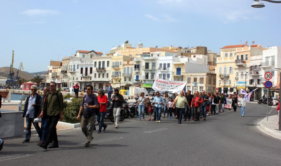 Οι εργαζόμενοι μετά την ολοκλήρωση της συγκέντρωσης, κατευθύνθηκαν με πορεία στο λιμάνι και συγκεκριμένα στο ύψος της Αποκεντρωμένης Διοίκησης Αιγαίου, όπου και συνενώθηκαν με τους εργαζόμενους από το Σύλλογο Υπαλλήλων Αιρετής Περιφέρειας Νοτίου Αιγαίου, την Πρωτοβουλία Εργαζομένων Ανέργων Σύρου Μυκόνου, την ΕΛΜΕ Α’ Κυκλάδων, το Σύλλογο Δασκάλων και Νηπιαγωγών Σύρου – Τήνου – Μυκόνου, το παράρτημα του Πανελλαδικού Σωματείου Εργατών Μετάλλου, το Σωματείο Εργαζομένων της Αποκεντρωμένης Διοίκησης Αιγαίου, το Σωματείο Εργαζομένων Σούπερ Μάρκετ Νεωρίου, το Σωματείο Ιδιωτικών Υπαλλήλων Κυκλάδων και η τοπική διοικούσα της Πανελλήνιας Ένωσης Τεχνικών ΟΤΕ.