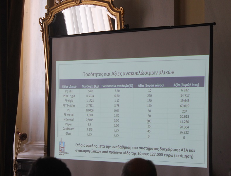 Κατόπιν της αναφοράς των προσπαθειών που αναπτύσσει η δημοτική πλευρά για τη Σύρο σε επίπεδο δυνατοτήτων ακόμη καλύτερης διαχείρισης των απορριμμάτων, αλλά και σε επίπεδο αναβάθμισης των υποδομών της, ακολούθησε η παρουσίαση των αποτελεσμάτων από τον Δρ. Πέτρο Γκίκα, αναπληρωτή καθηγητή του Τμήματος Μηχανικής Περιβάλλοντος του Πολυτεχνείου Κρήτης και επιβλέποντος της μελέτης μορφολογικής ανάλυσης ΑΣΑ για τη Σύρο.