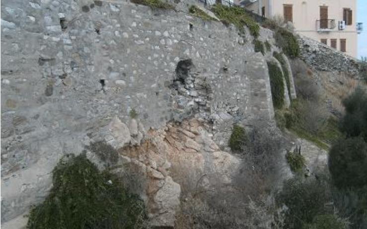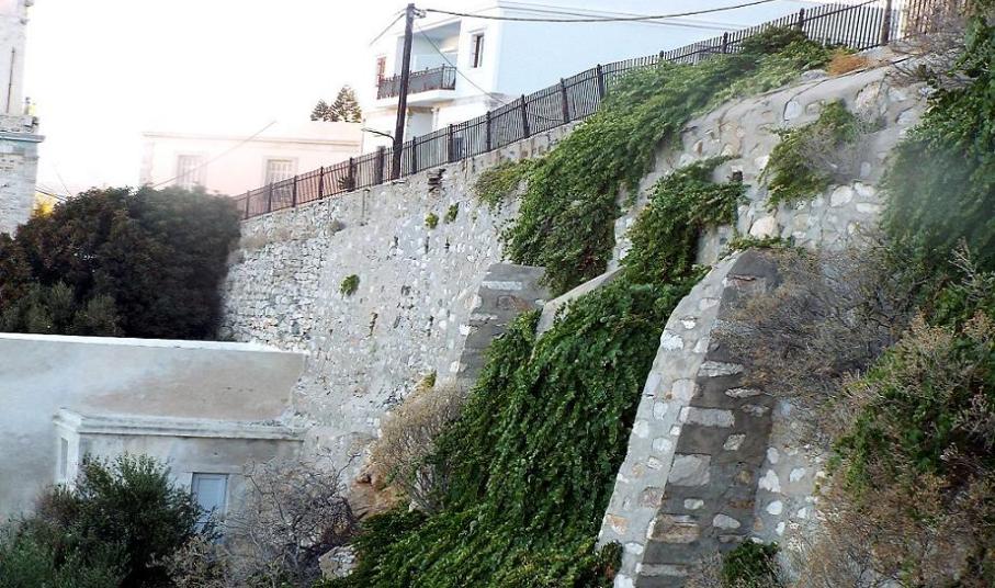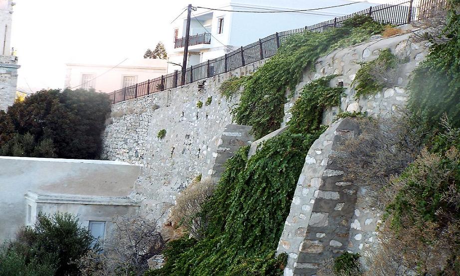 Το λιθόχτιστο τοιχίο, το οποίο παρουσιάζει έντονα στοιχεία κατάρρευσης και το οποίο όλο το τελευταίο χρονικό διάστημα έχει αποκλειστεί, με απαγορευτικό για τους πεζούς πλέγμα διέλευσης, είναι το πρώτο δομικό στοιχείο επί του οποίου ξεκίνησαν και οι πρώτες εργασίες.