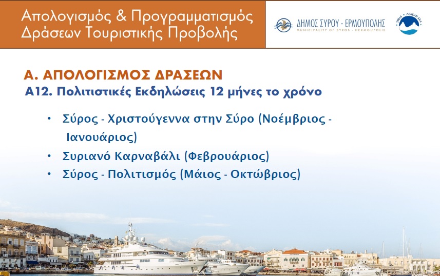 Ειδικότερα, σαφής υπήρξε η αναφορά του δημάρχου στο κομμάτι των προτεραιοτήτων που έχει θέσει η Δημοτική Αρχή σχετικά με την προσπάθεια τουριστικής ανάπτυξης της Σύρου. Σε αυτές τις προτεραιότητες εντάσσεται η αξιολόγηση των τουριστικών τάσεων, η ισχυροποίηση και ο εμπλουτισμός των υπαρχόντων δράσεων (πολιτιστικές, αθλητικές και τουριστικές), καθώς επίσης η υλοποίηση νέων και στοχευμένων (καινοτόμων) δράσεων προώθησης και αναμφισβήτητα η συμμετοχή σε ευρωπαϊκά προγράμματα – δίκτυα. Κατά την παρουσίαση του προγραμματισμού, δόθηκε έμφαση στη συμμετοχή των δημοτών και των επιχειρηματιών του κλάδου, στο κομμάτι της αναβάθμισης του τουριστικού προϊόντος της Σύρου, στην κατεύθυνση που οι ίδιοι γίνονται πρεσβευτές διαφημιστικών εκστρατειών, στηρίζουν και συμμετέχουν στις προωθητικές ενέργειες.