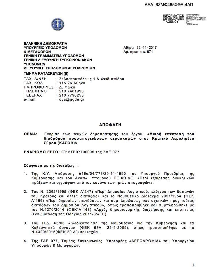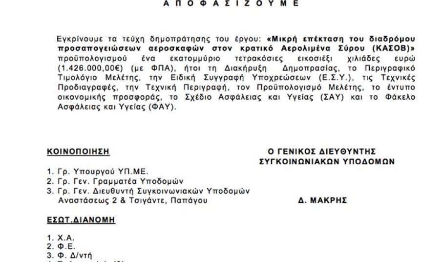 Όπως είχε αναφερθεί σε σχετικό άρθρο μας το οποίο είχε δημοσιευθεί στις 27/09/2017, ο Δήμαρχος κ. Γεώργιος Μαραγκός, με σημερινή προσωπική του ανακοίνωση, επιβεβαιώνει την οριστική έγκριση της δημοπράτησης του έργου για την επέκταση του Αεροδρομίου Σύρου, με ημερομηνία διαγωνισμού την 23/01/2018, και επισυνάπτει τα σχετικά έγγραφα.