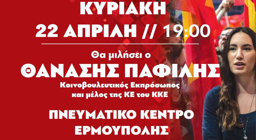 Η ΚΟ Σύρου του ΚΚΕ σας προσκαλεί στην πολιτική εκδήλωση που θα πραγματοποιήσει την Κυριακη 22 Απριλίου στις 19.00, στο Πνευματικό Κέντρο Ερμούπολης με ομιλητή τον Θανάση Παφίλη, Κοινοβουλευτικό Εκπρόσωπο και µέλος της ΚΕ του ΚΚΕ.