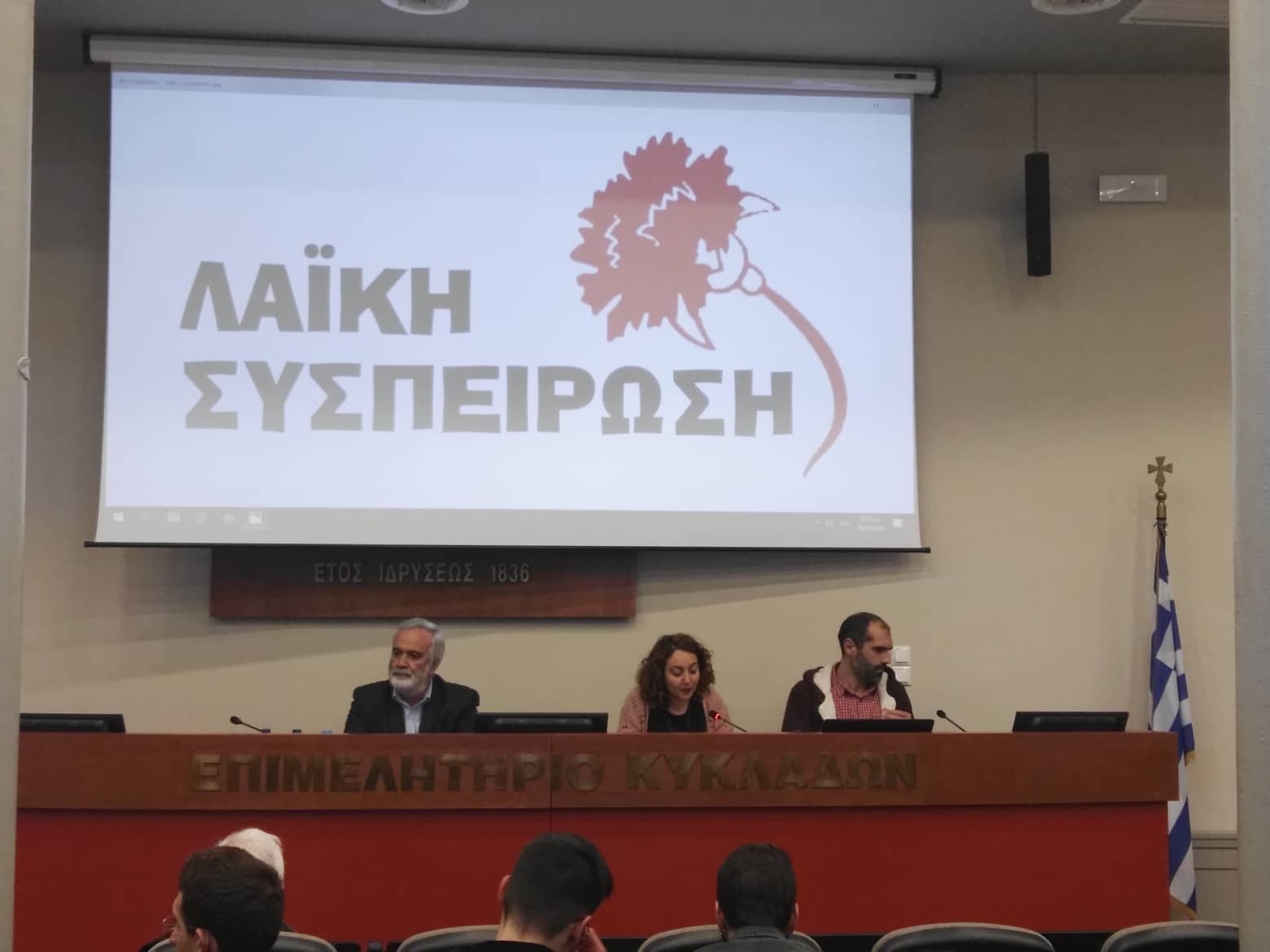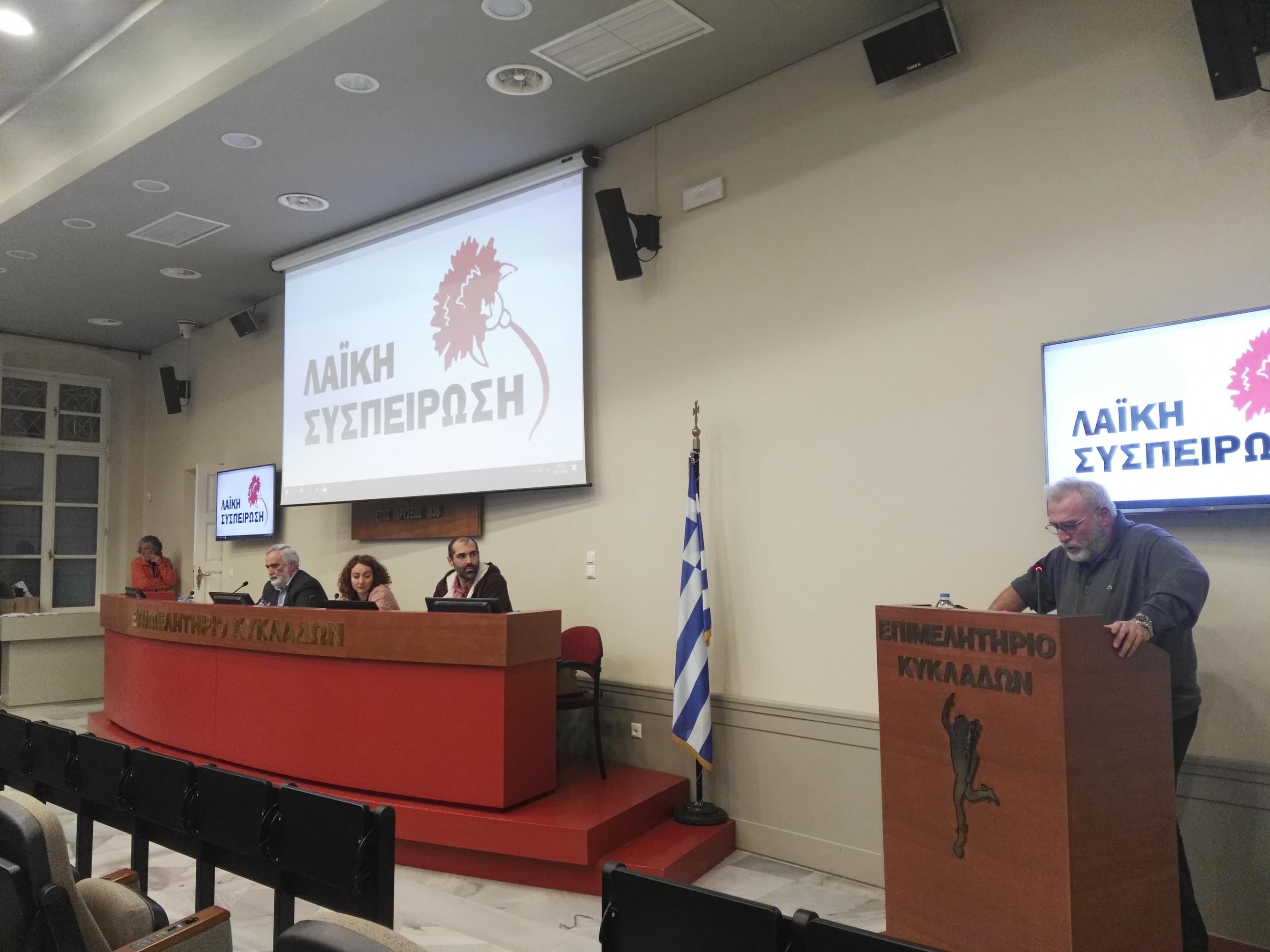 Σε συστράτευση με τη Λαϊκή Συσπείρωση κάλεσαν τους πολίτες, οι επικεφαλής των ψηφοδελτίων σε Περιφέρεια Ν. Αιγαίου και Δήμο Σύρου - Ερμούπολης, Γιάννης Ντουνιαδάκης και Νικόλας Καΐλης, αντίστοιχα, κατά τη διάρκεια των ομιλιών τους, στο πλαίσιο της πολιτικής εκδήλωσης του ΚΚΕ στη Σύρο ενόψει των επερχόμενων εκλογών στην Αυτοδιοίκηση.