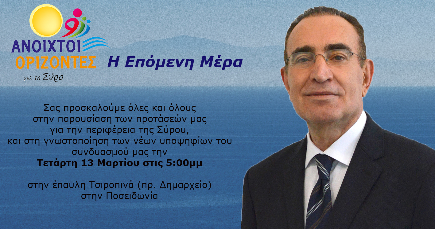 Ο υποψήφιος Δήμαρχος Σύρου – Ερμούπολης, κ. Νίκος Λειβαδάρας και τα μέλη της παράταξης “Ανοιχτοί Ορίζοντες για τη Σύρο”, σας προσκαλούν στην παρουσίαση των προτάσεων της παράταξης, για την περιφέρεια της Σύρου και στη γνωστοποίηση των νέων υποψηφίων του συνδυασμού, την Τετάρτη 13 Μαρτίου, στις 5 μ.μ., στην Έπαυλη Τσιροπινά (πρ. Δημαρχείο Ποσειδωνίας).
