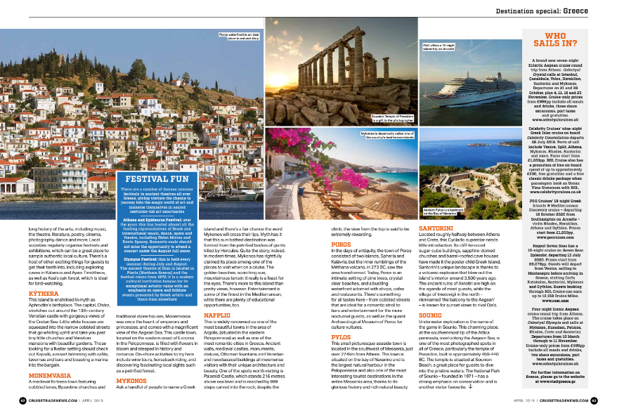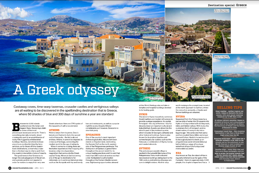 Κατόπιν της ανάδειξης της Ελλάδας ως ο «καλύτερος προορισμός κρουαζιέρας παγκοσμίως» - «Best Destination (Port or Country)» στα Wave Awards 2019 του Ην. Βασιλείου, τα καταξιωμένα βραβεία αριστείας και καινοτομίας στο τομέα της κρουαζιέρας, η Σύρος δεσπόζει στην αρχική σελίδα τετρασέλιδου άρθρου του CRUISE TRADE NEWS, κορυφαίου περιοδικού του Ην. Βασιλείου για τον κλάδο της κρουαζιέρας, το οποίο βοηθά ταξιδιωτικούς πράκτορες και συμβούλους κρουαζιέρας να πωλούν διακοπές κρουαζιέρας πιο αποτελεσματικά. Σκοπός του είναι να ενημερώσει, να εκπαιδεύσει και να προσφέρει πρακτικές συμβουλές για να βοηθήσει τους πράκτορες να ταιριάξουν τους πελάτες τους με τις ιδανικές διακοπές κρουαζιέρας.