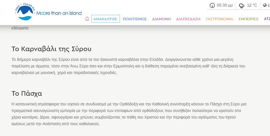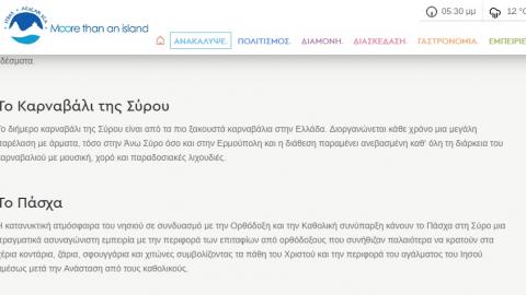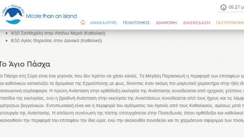 Αν και η ίδια η Δημοτική Αρχή έχει πολλάκις κάνει λόγο για αξιοποίηση των σύγχρονων εργαλείων που προσφέρει το διαδίκτυο, ωστόσο, η ίδια επιδεικνύει προκλητική αδιαφορία ακόμη και για τα δικά της ακριβοπληρωμένα μέσα, όπως το τουριστικό portal (syrosisland), στο οποίο οι δύο αναφορές που υπάρχουν για το Πάσχα στη Σύρο, χαρακτηρίζονται από προχειρότητα στη σύνταξη και το περιεχόμενο, ενώ μάλιστα δεν ταυτίζονται.