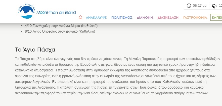 Ωστόσο, μία επίσκεψη στο portal της Σύρου (syrosisland) αποδεικνύει – τουλάχιστον ως χθες το απόγευμα – πως το εν λόγω βίντεο δεν είναι αναρτημένο, ενώ υπάρχουν τρεις διαφορετικές αναφορές για την Πασχαλινή περίοδο, με τις δύο εξ αυτών να αφήνονται στην κρίση των αναγνωστών για την ποιότητά τους.