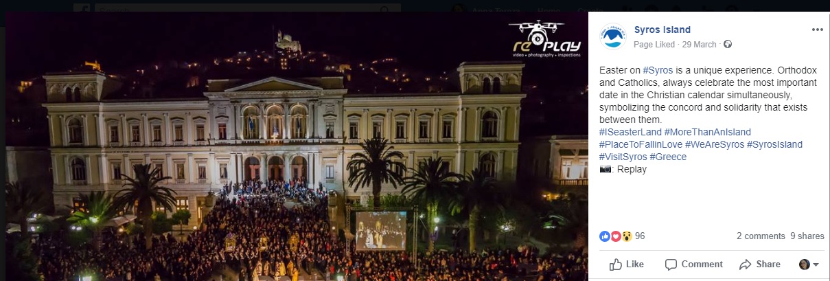 Κατόπιν των ανωτέρω, ο κ. Σαγκινέτος ερωτηθείς για την πρόοδο των αναρτήσεων στη σχετική σελίδα στο facebook, τόνισε πως το βίντεο για το Πάσχα στη Σύρο “Φυσικά εκεί θα ξεκινήσει να παίζει συνέχεια. Γιατί ένας που θα ενδιαφερθεί κακά τα ψέματα πρώτα εκεί μπαίνει”. Κατόπιν των λεγομένων του, η εφημερίδα “περιηγήθηκε” στη σελίδα syros island στο facebook, διαπιστώνοντας πως κι εκεί μέχρι στιγμής – είκοσι περίπου μέρες πριν το Πάσχα – έχουν πραγματοποιηθεί δύο συγκεκριμένες κινήσεις. Η πρώτη αφορά στην αντικατάσταση της φωτογραφίας εξωφύλλου και η δεύτερη σε μία ανάρτηση για την περιφορά των Επιτάφιων στην πλατεία Μιαούλη.